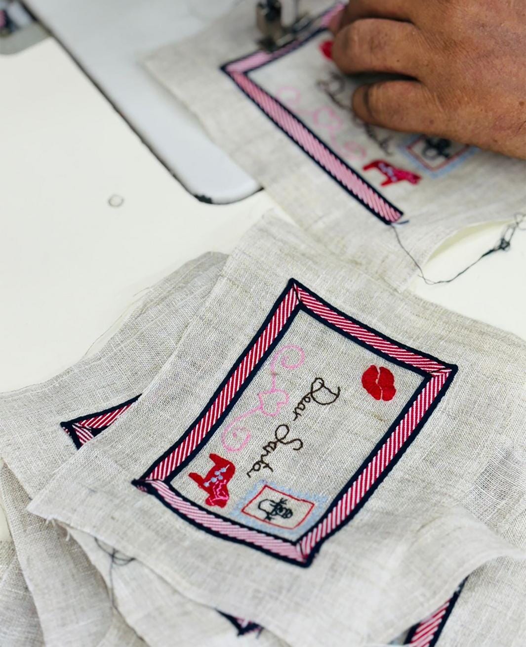 Weihnachtsschmuck von Sissel Edelbo, aus Leinen in einem beigen Farbton gefertigt. Das Ornament hat gestickten Text und weihnachtliche Dekorationen.