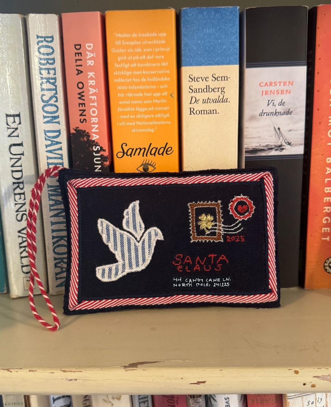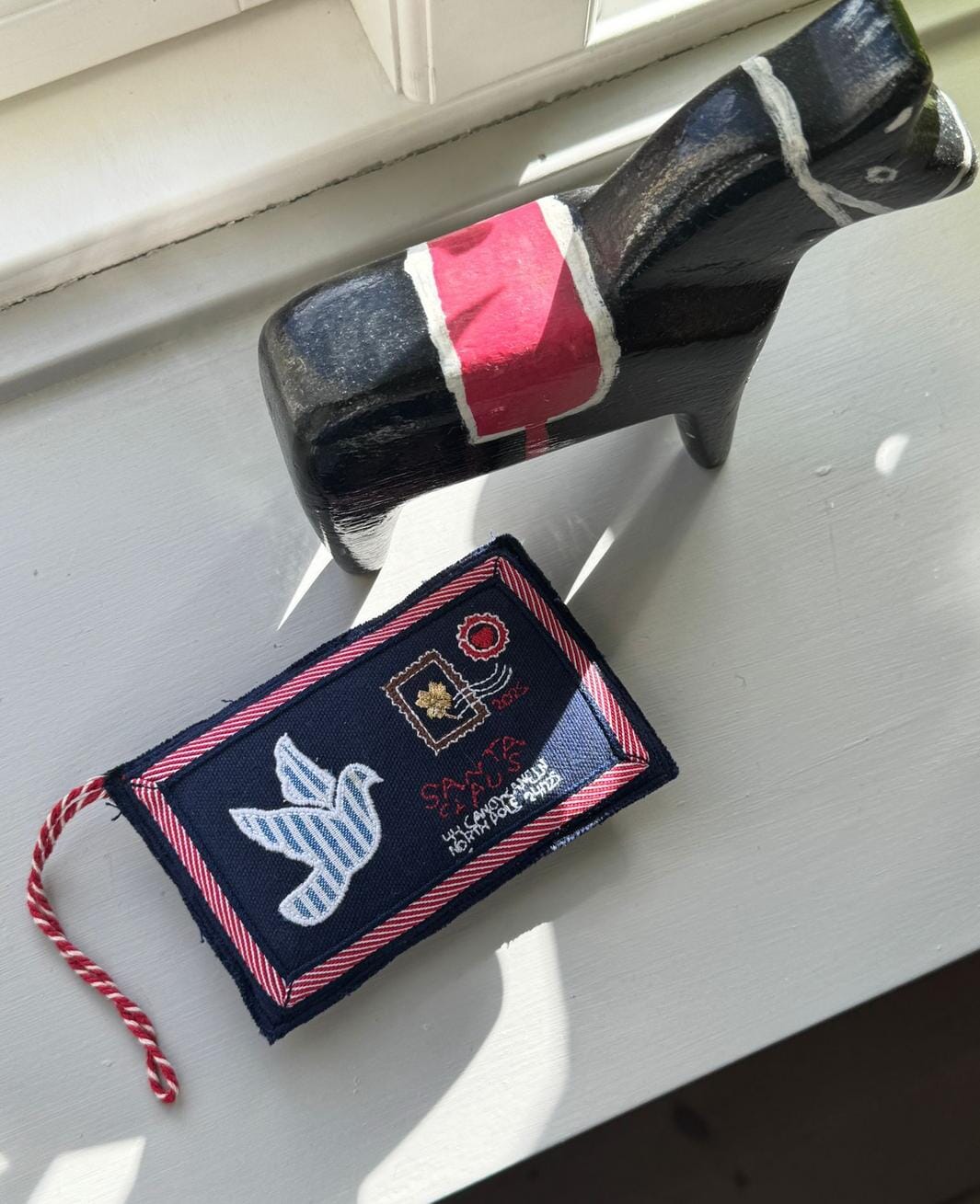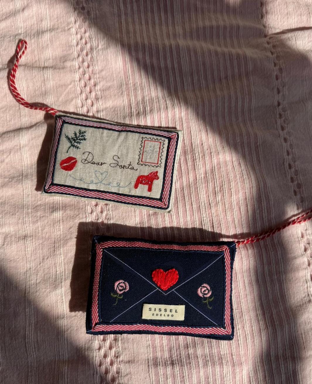 Weihnachtsschmuck von Sissel Edelbo in Form eines Umschlags aus dunkelblauer Baumwolle. Das Ornament hat eine Friedenstaube-Applikation und gestickte Details mit Herzen, Rosen und Briefmarken.