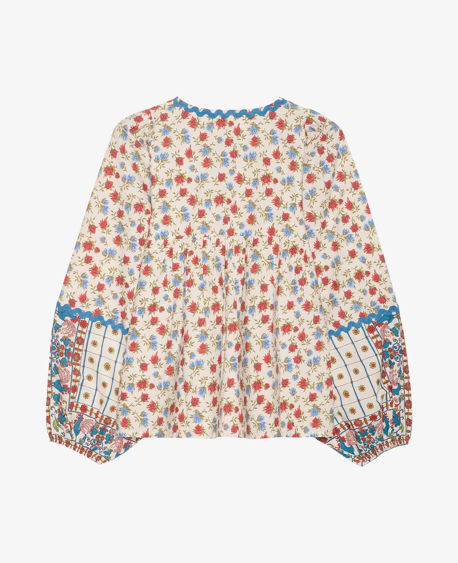 Top von Sissel Edelbo mit mehrfarbigem Blumenprint in roten und blauen Nuancen auf cremeweißem Grund. Das Top eignet sich sowohl für den Alltag als auch für festliche Anlässe.