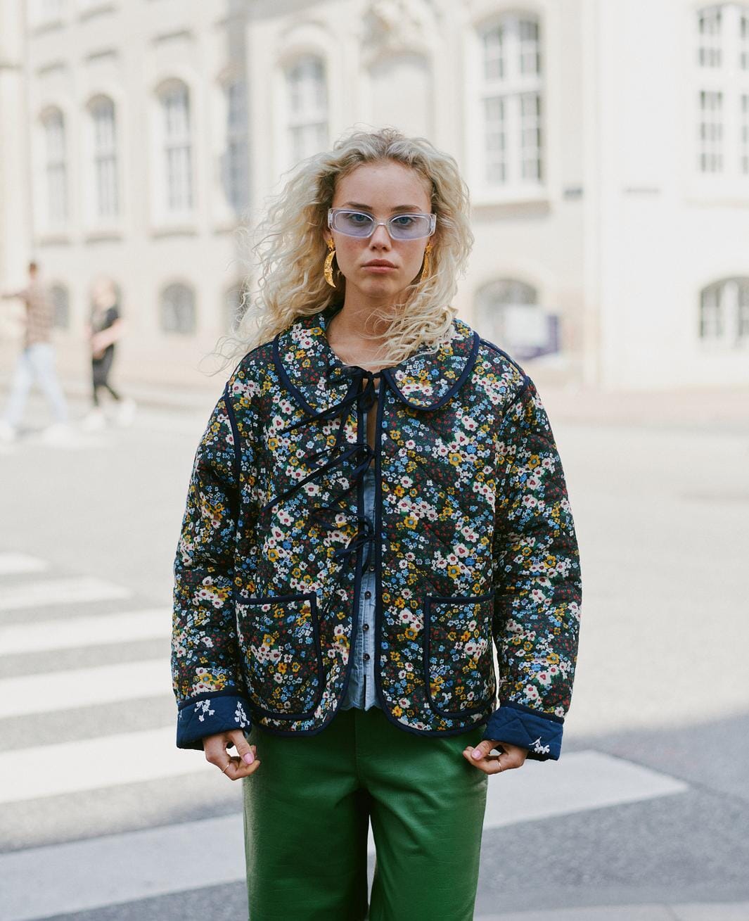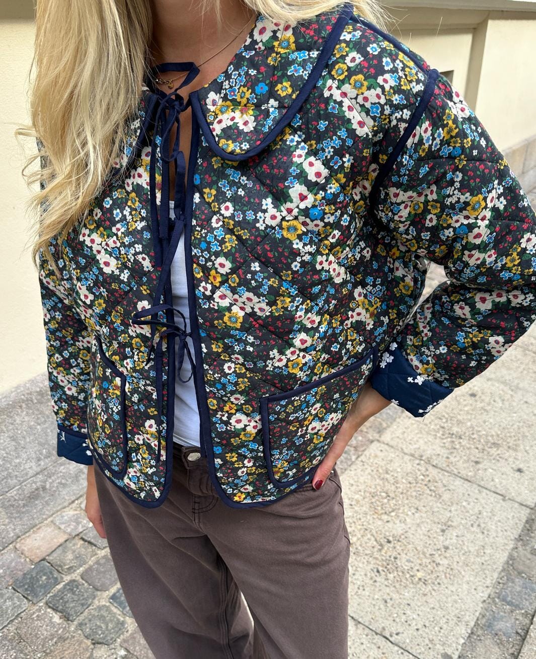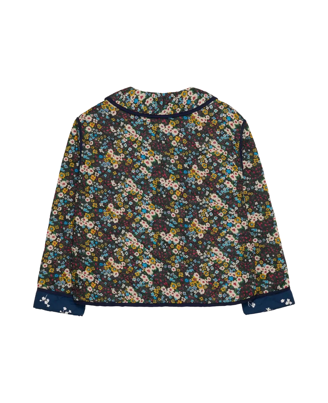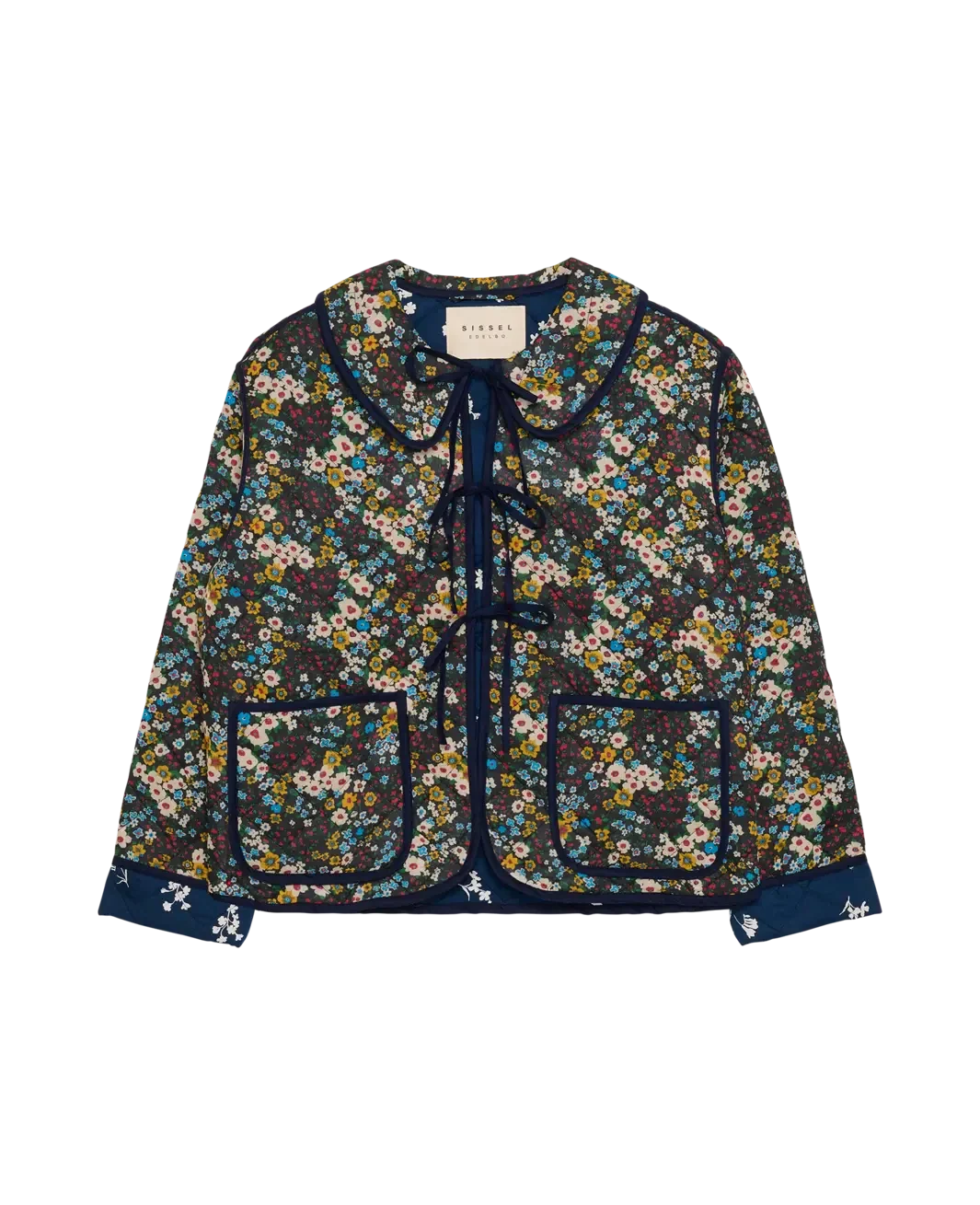 Quiltjacke von Sissel Edelbo mit floralem Muster auf dunklem Grund. Die Jacke hat einen breiten Peter-Pan-Kragen und drei Sets Bindebänder vorne zum Schließen.