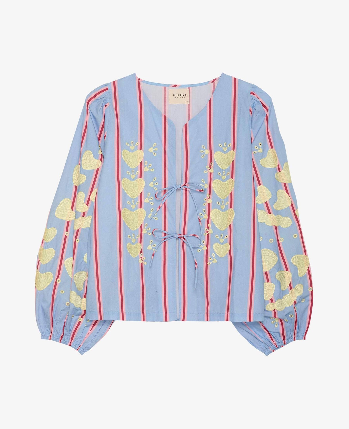 Hellblaues Top von Sissel Edelbo mit roten Streifen und grünen Herzstickereien. Das Top besteht aus 100 % Bio-Baumwollpopeline mit offener Front.