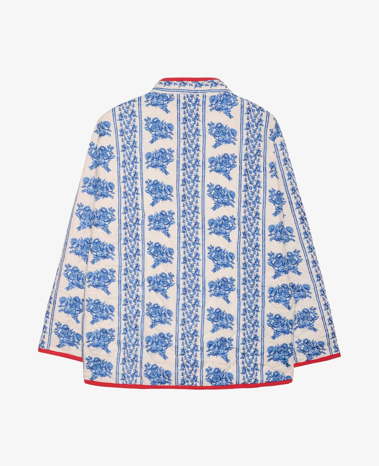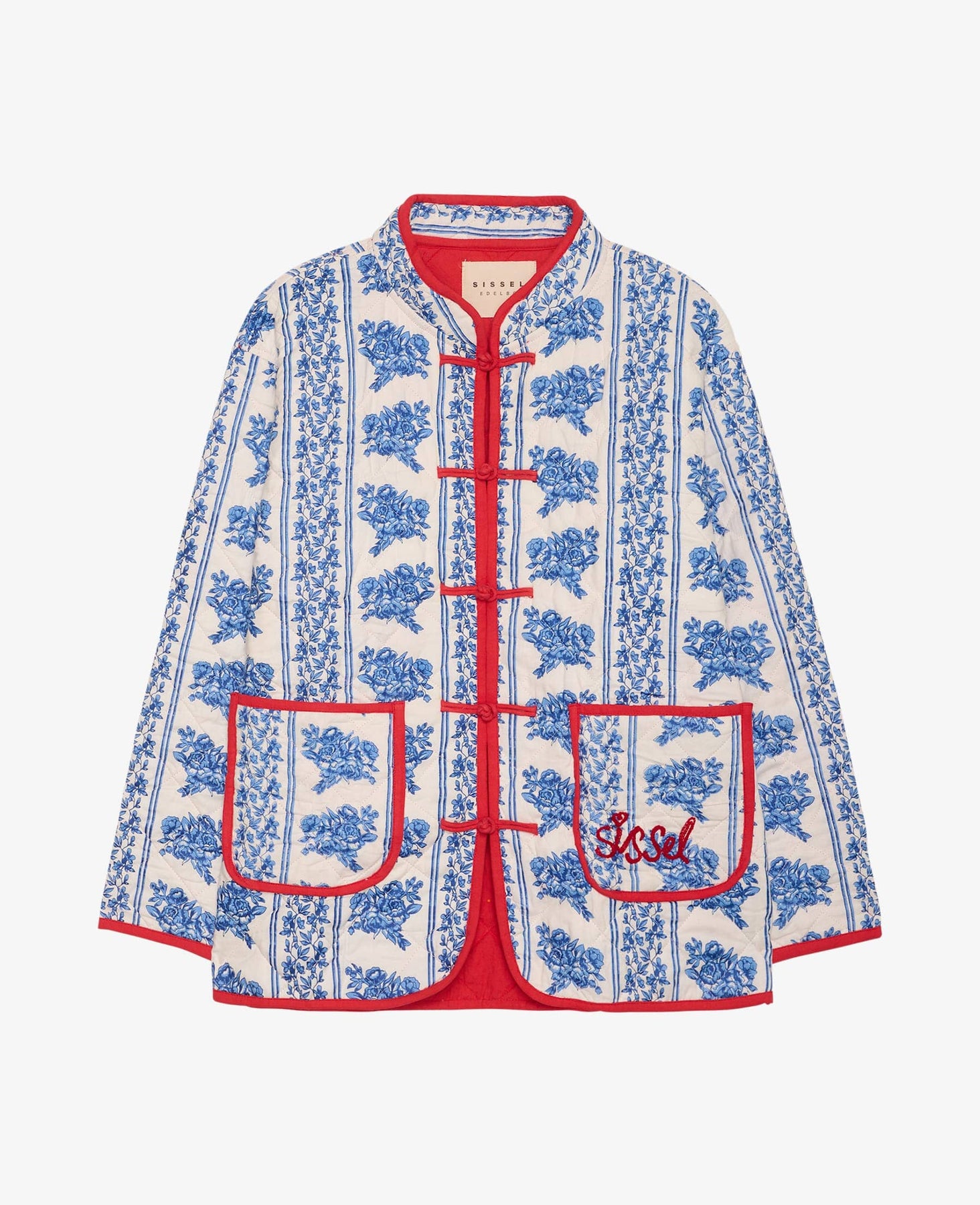 Jacke von Sissel Edelbo mit blauem Blumenmuster auf weißem Hintergrund. Die Jacke hat rote Kanten entlang der Vorderseite und an den Taschen.