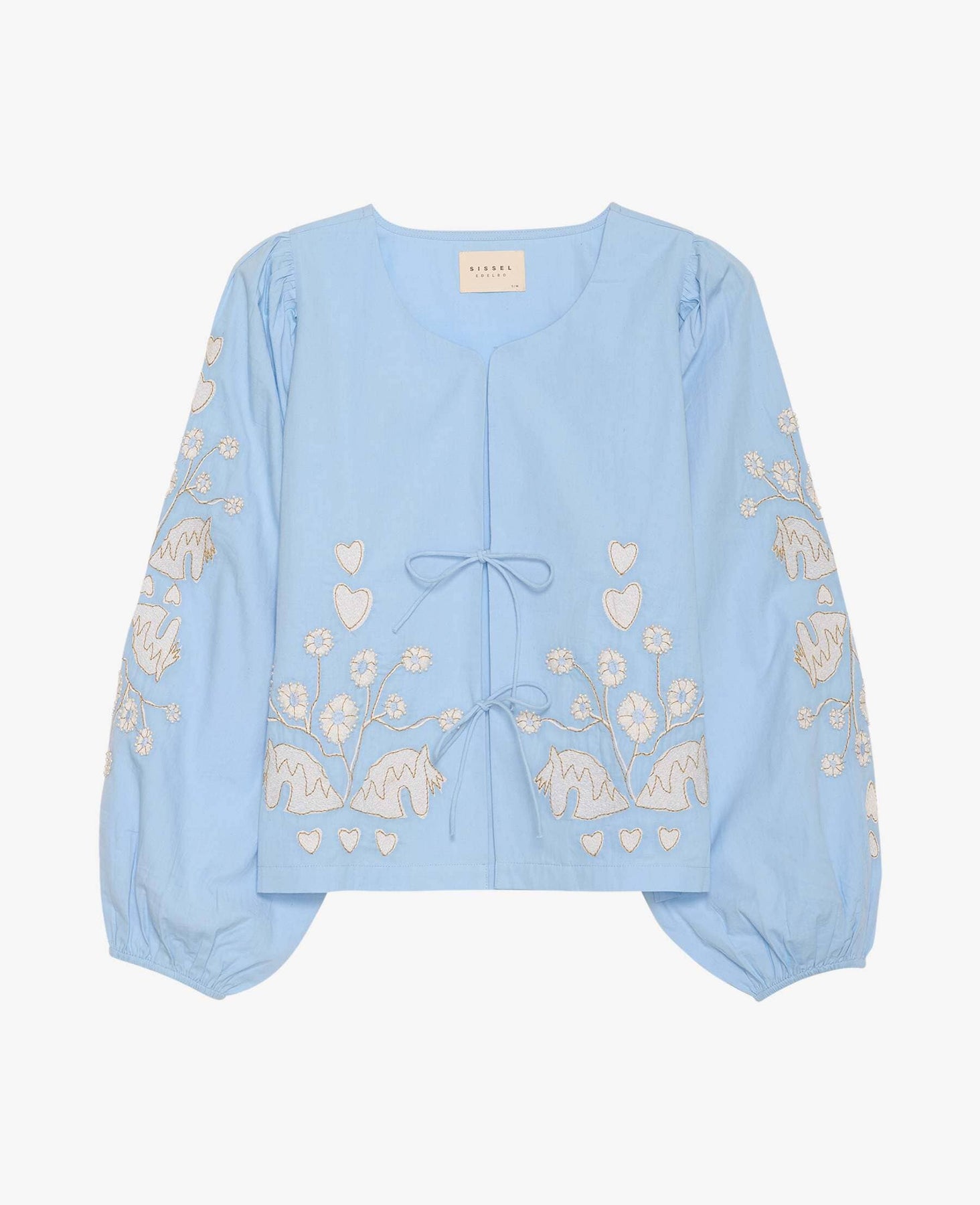 Hellblaue Bluse von Sissel Edelbo mit gestickten Herzen und Blumen auf der Vorderseite und an den Ärmeln. Die Bluse hat Bindedetails vorne und Perlenverzierungen.