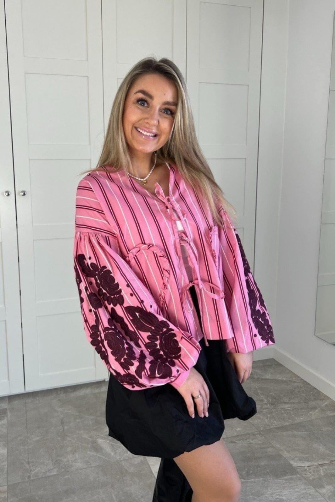 Gestreifter Top von Sissel Edelbo aus Bio-Baumwolle. Der pinke Top hat bordeauxfarbene Blumenmuster an den Ärmeln und drei Sets Bindebänder vorne.