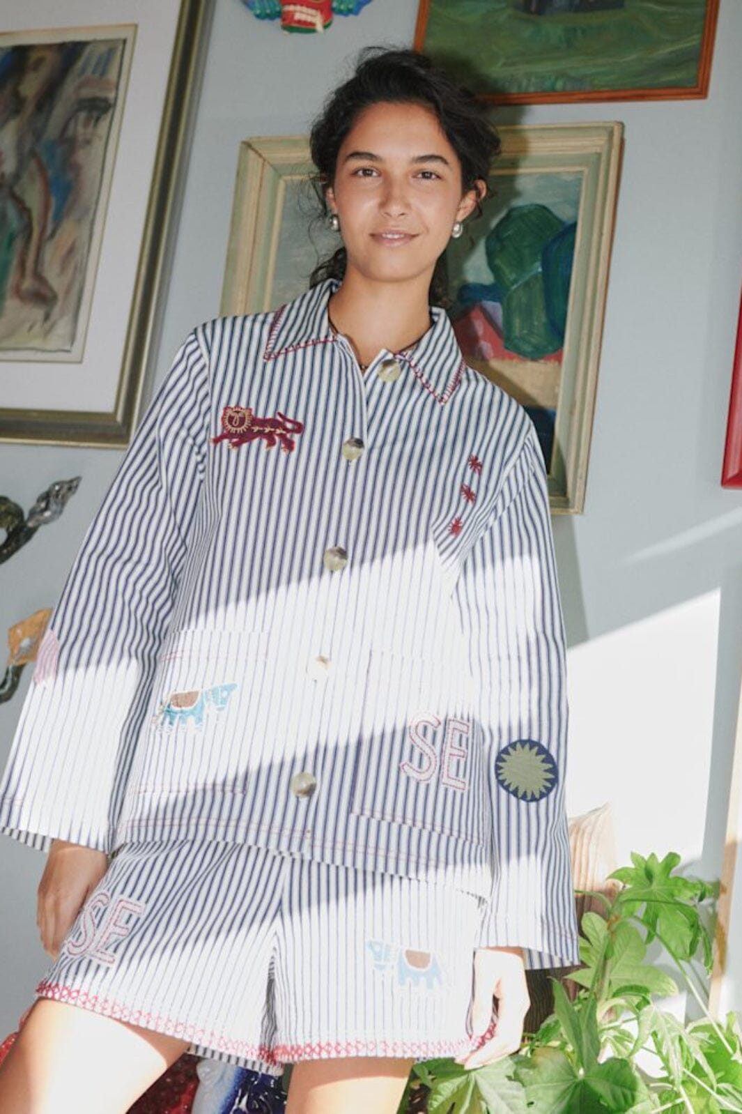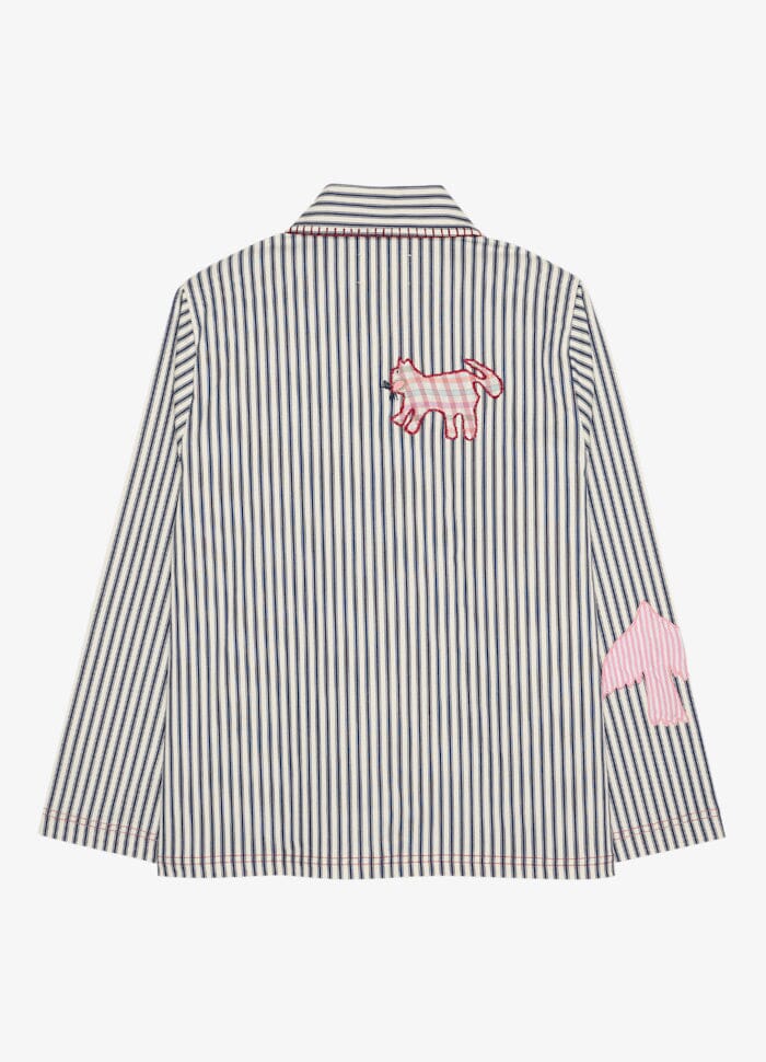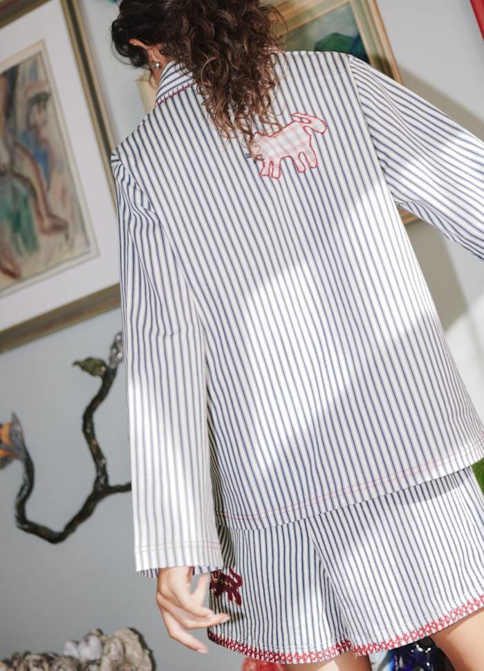Gestreifte Jacke von Sissel Edelbo mit bestickten Motiven wie Sonne, Tiger und Pferd. Die Jacke besteht aus überschüssigem Baumwollcanvas mit 3 % Stretch.