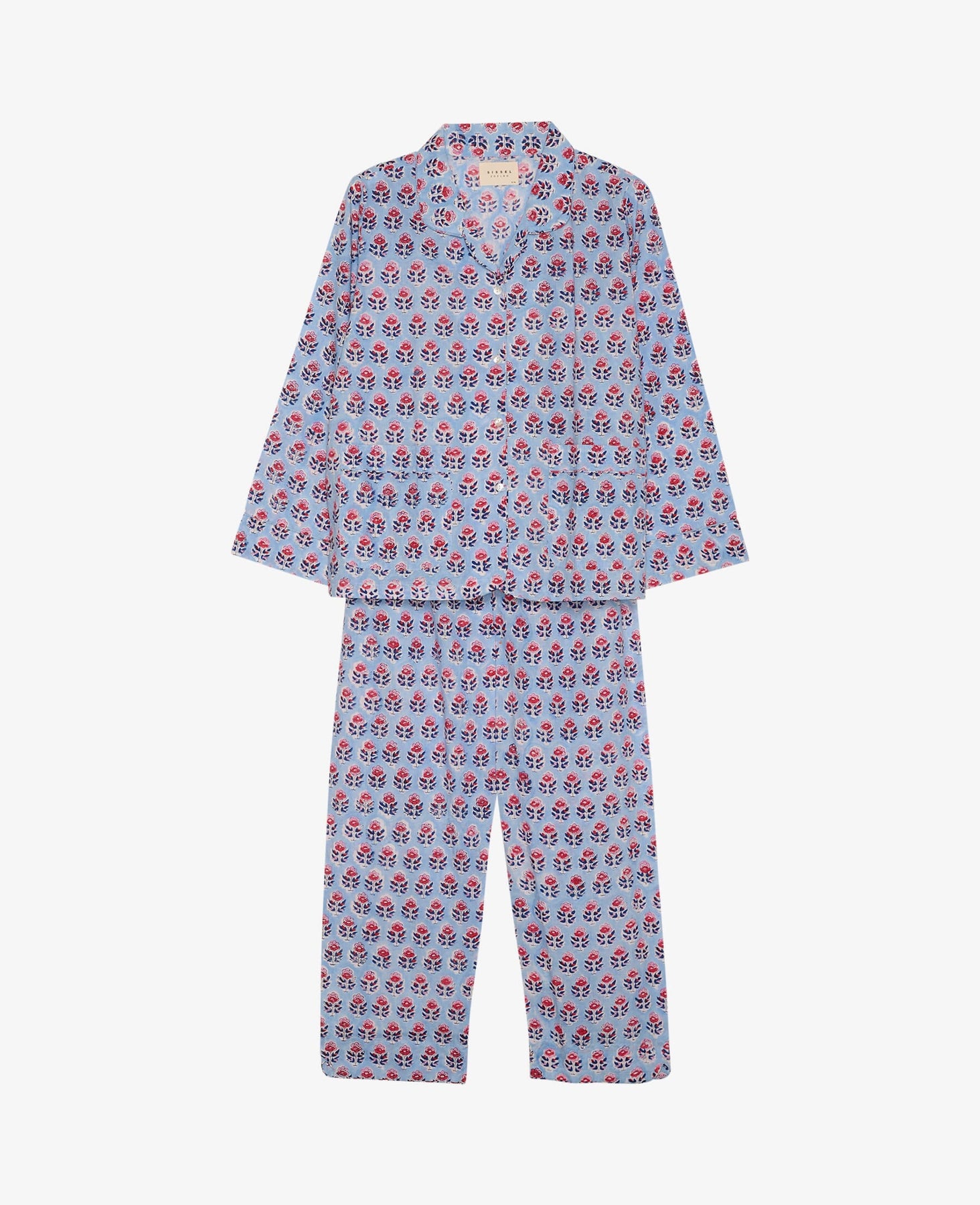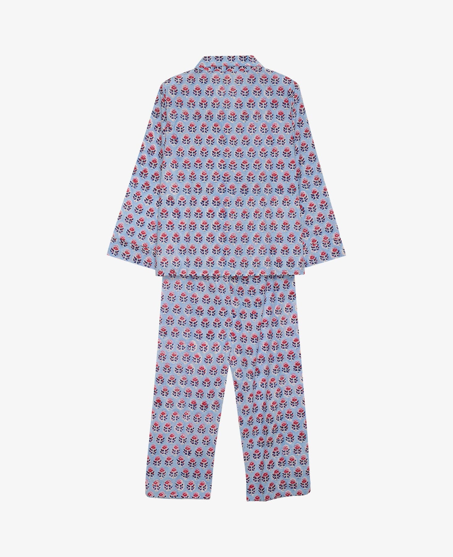 Pyjama-Set von Sissel Edelbo mit Blumenmuster in Rot- und Dunkelblautönen auf hellblauem Hintergrund. Das Set besteht aus 100 % Bio-Baumwolle mit traditionellen indischen Blockdrucken.