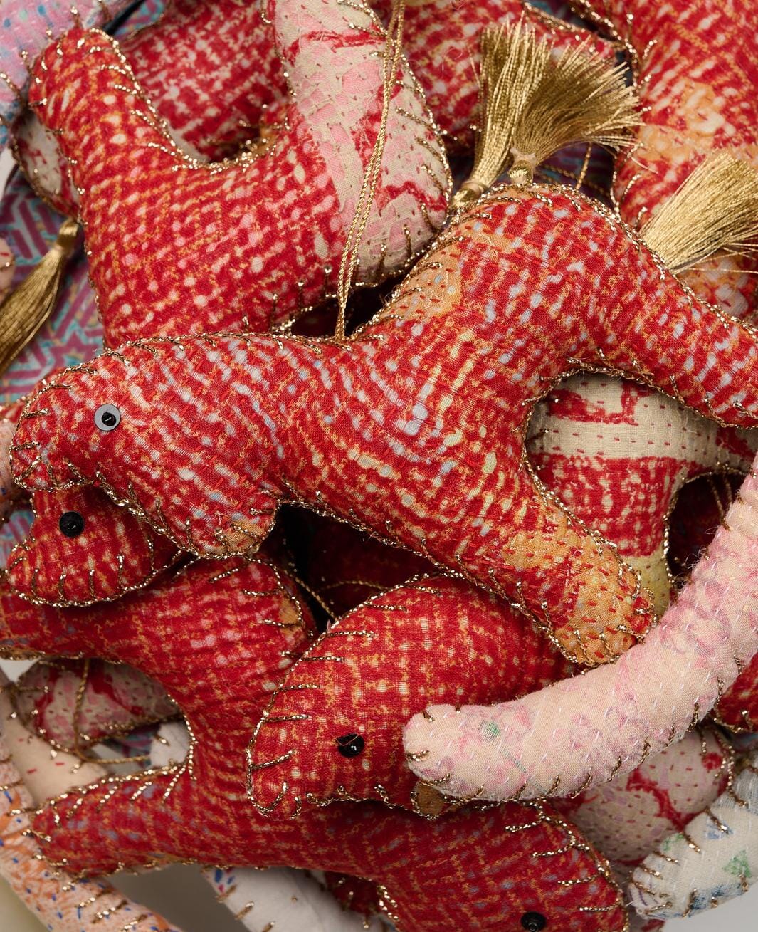Schaukelpferd- Ornament von Sissel Edelbo, hergestellt aus Resten von Kantha-Teppichen. Das Ornament hat ein rotes und weißes Muster mit einem goldenen Quast als Schwanz.