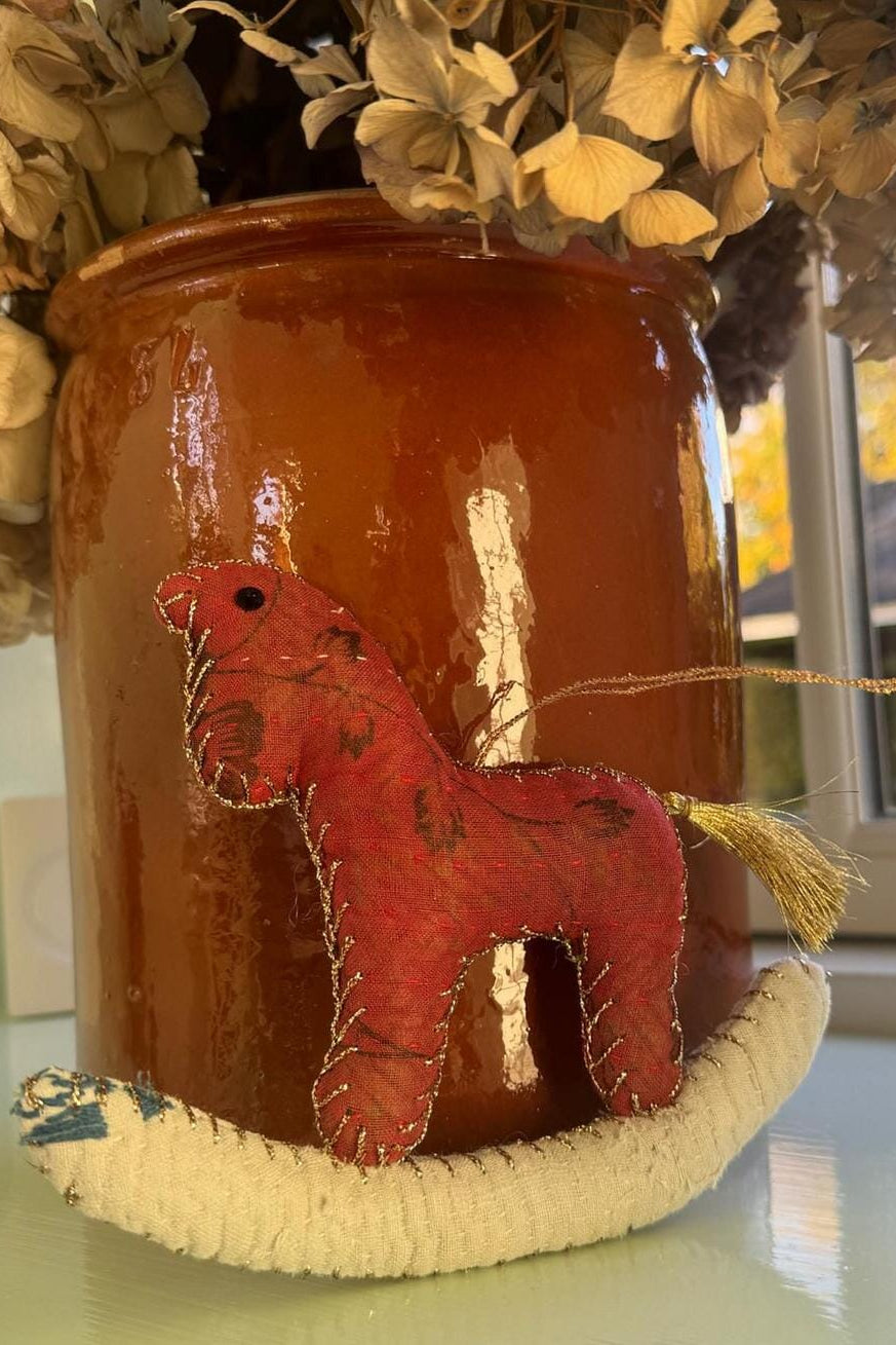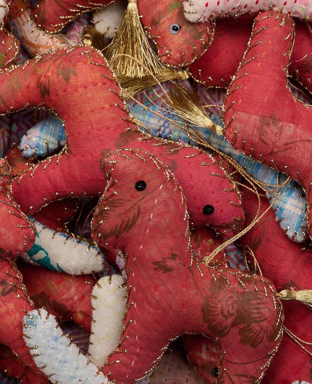 Wipp-Pferd- Ornament von Sissel Edelbo, hergestellt aus Resten von Kantha-Teppichen. Jedes Ornament hat einen roten Körper mit weißem Boden und goldener Quaste.