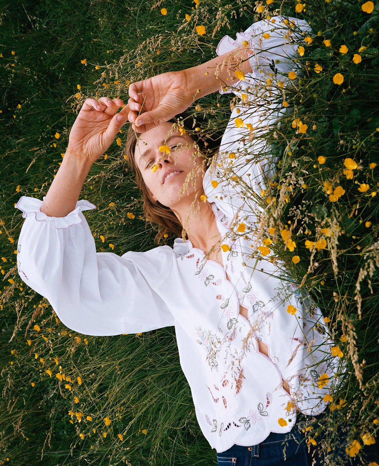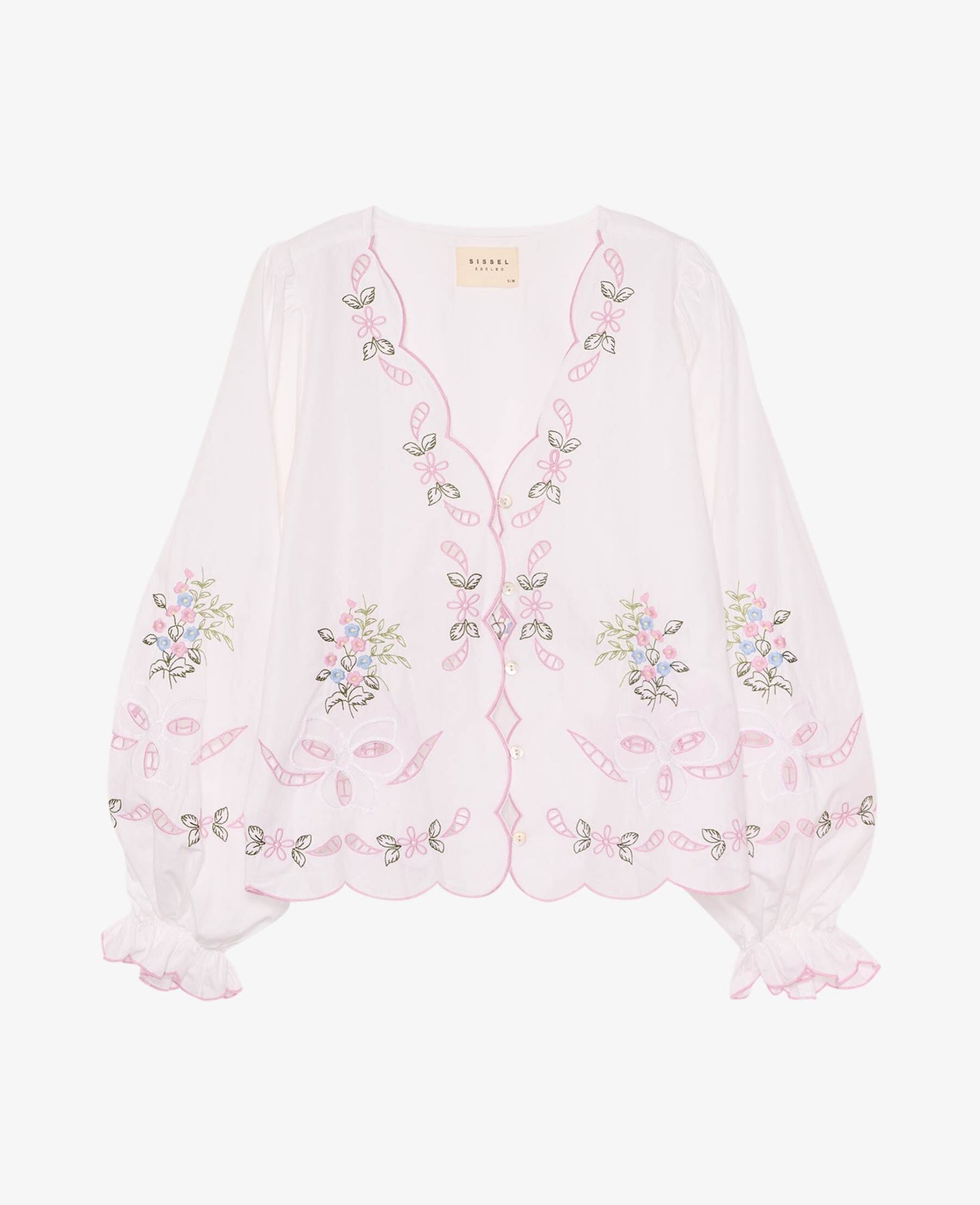 Weiße Bluse von Sissel Edelbo mit pastellfarbenen Blumenstickereien auf der Vorderseite und an den Ärmeln. Die Bluse hat eine lockere Passform und lange Ärmel.