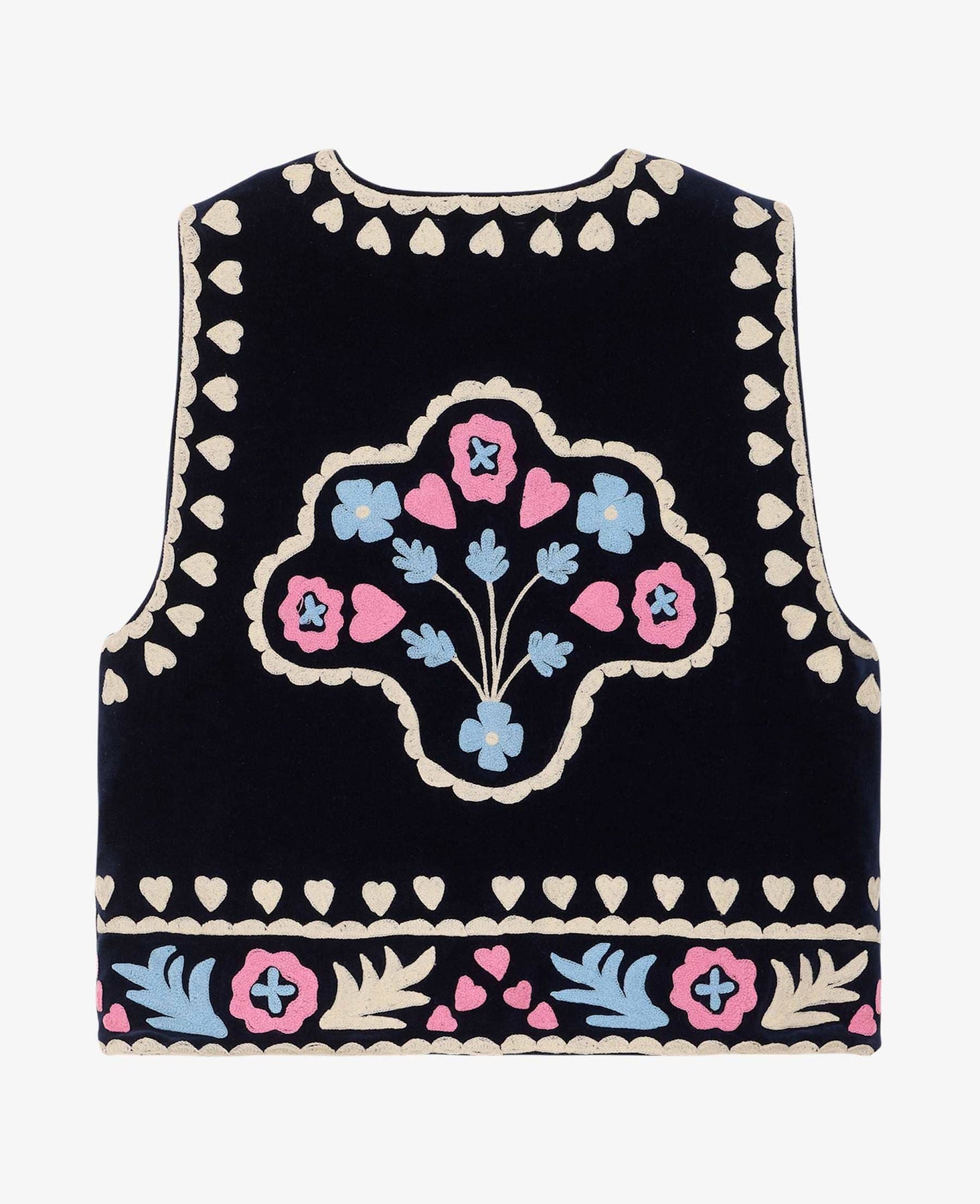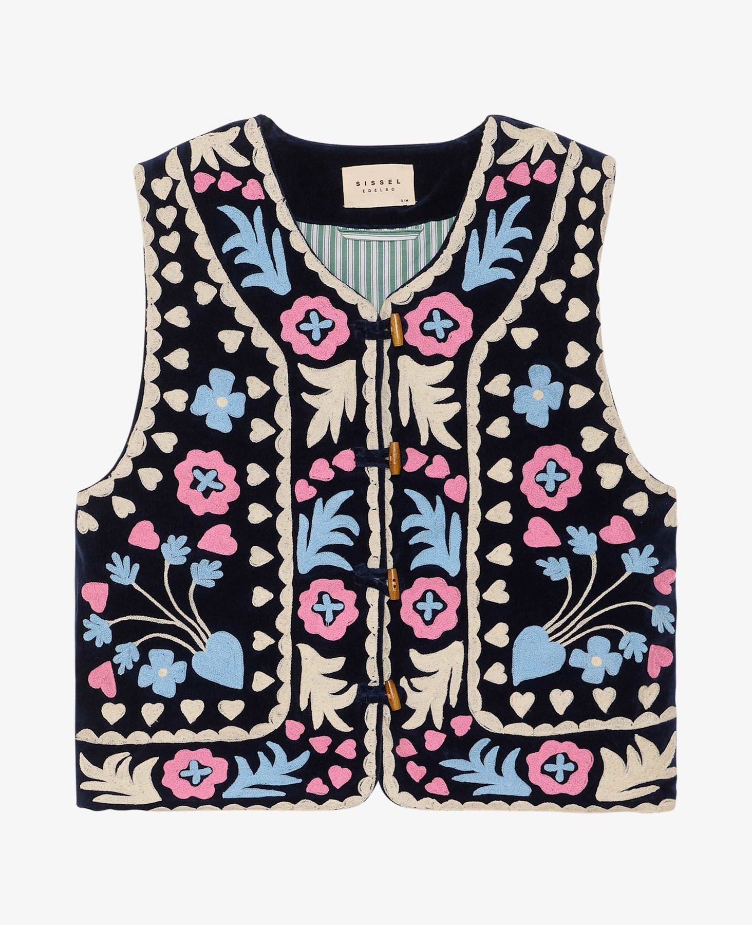Dunkelblaue Weste von Sissel Edelbo mit Suzani-Stickerei im Blumendesign. Hergestellt aus überschüssiger Veloursbaumwolle und gefüttert mit gestreifter Baumwolle.