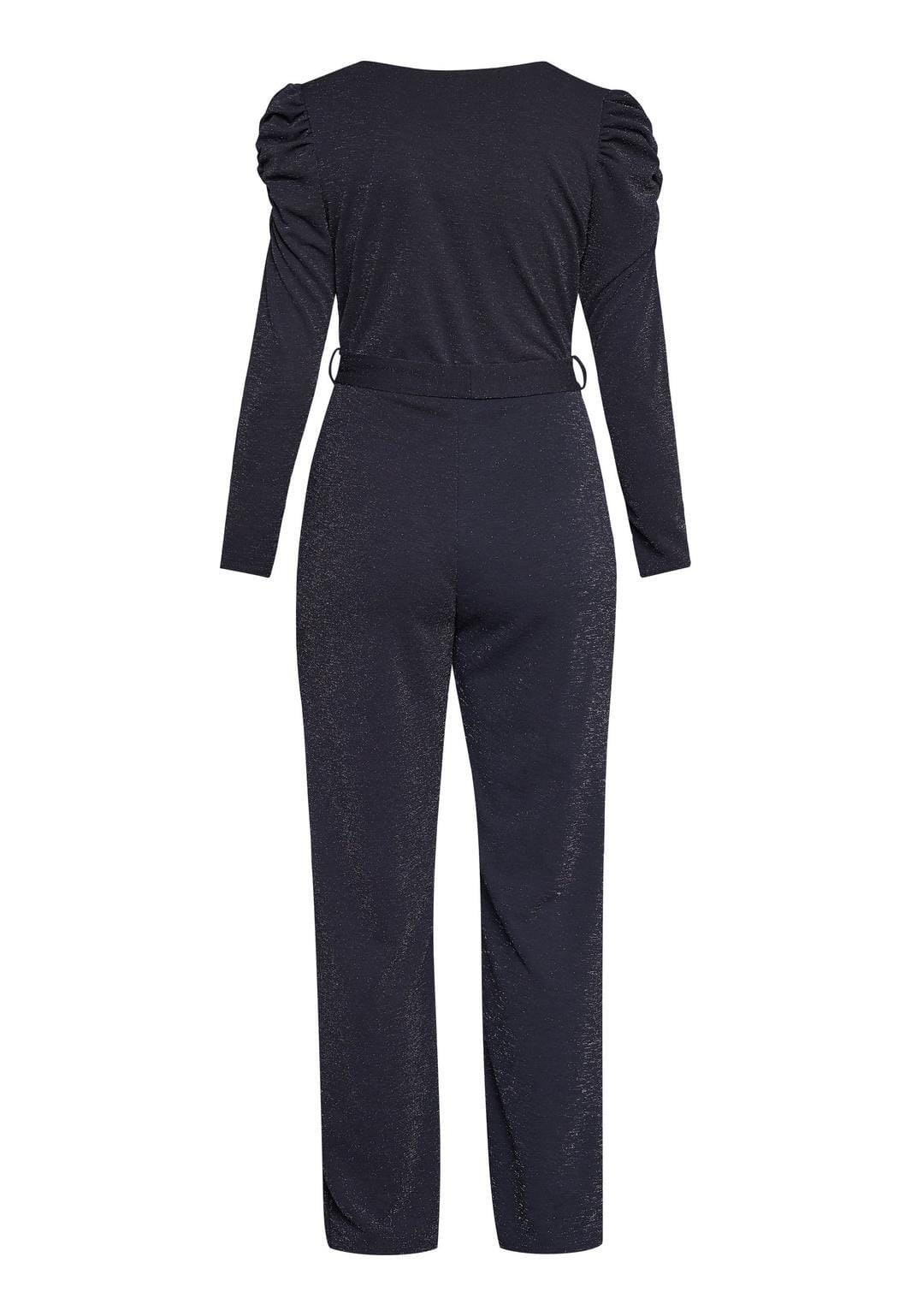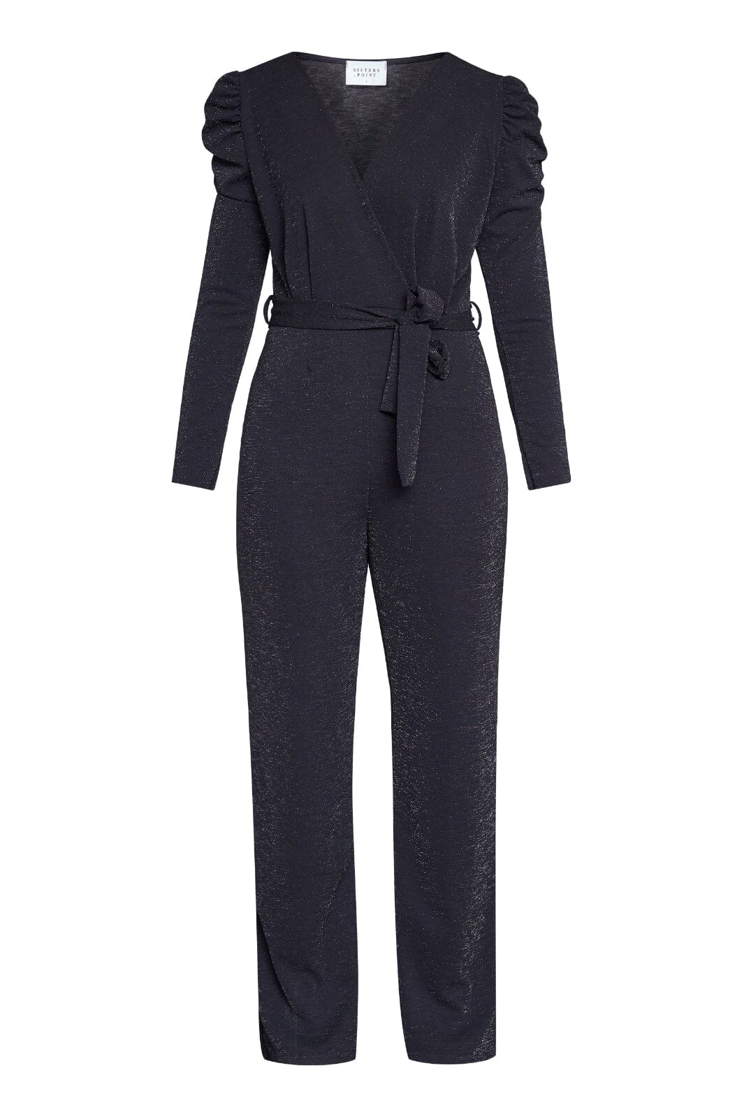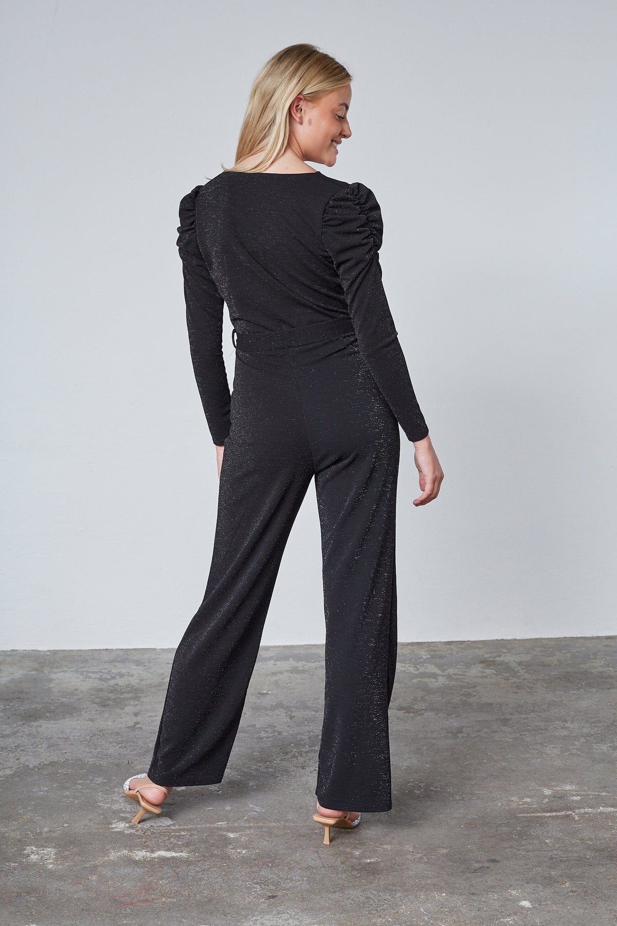 Schwarzer Jumpsuit von Sisters Point mit Silberglitzer-Effekt. Er hat einen V-Ausschnitt, Puffärmel mit gerafften Details an den Schultern und ein Bindeband in der Taille.