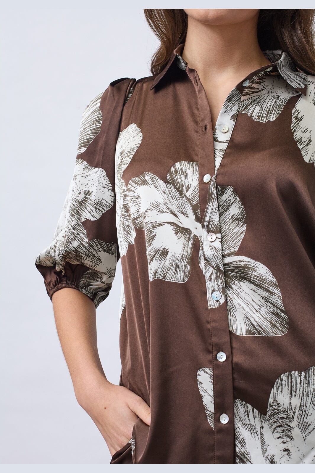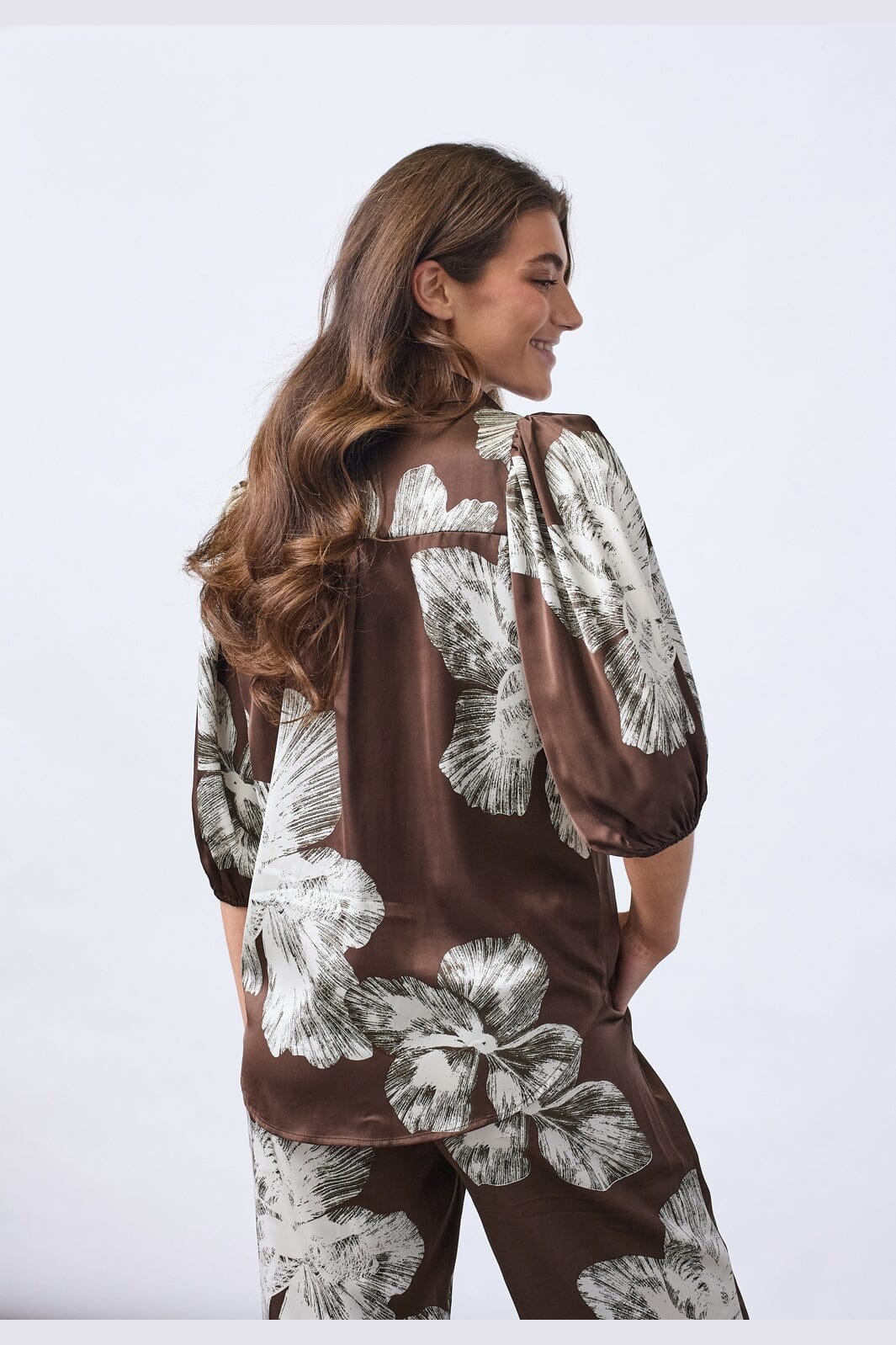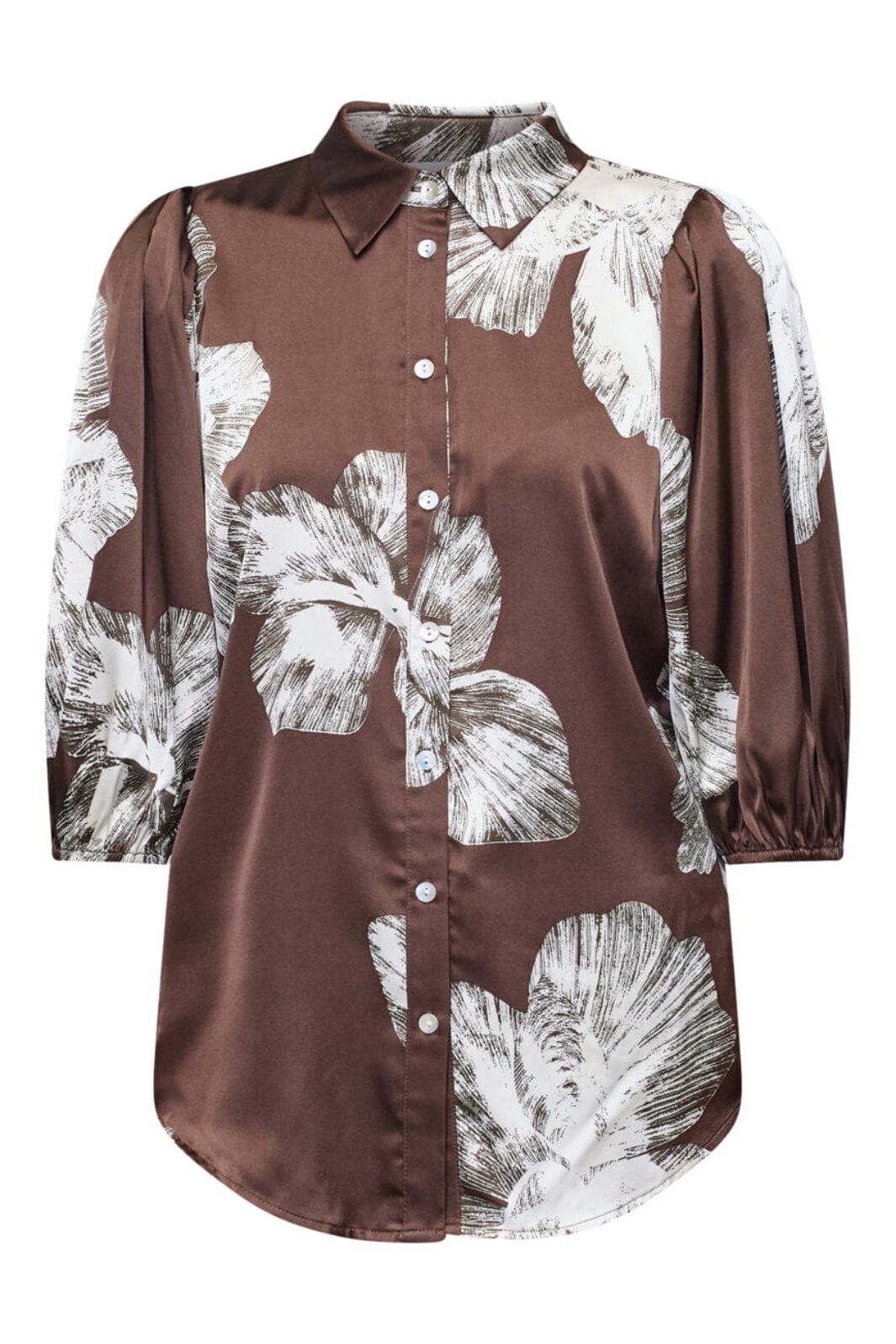 Bluse von Sisters Point aus braunem Satin mit grafischem Blumenprint in weißen Nuancen. Die Bluse hat einen klassischen Kragen und eine Knopfleiste.