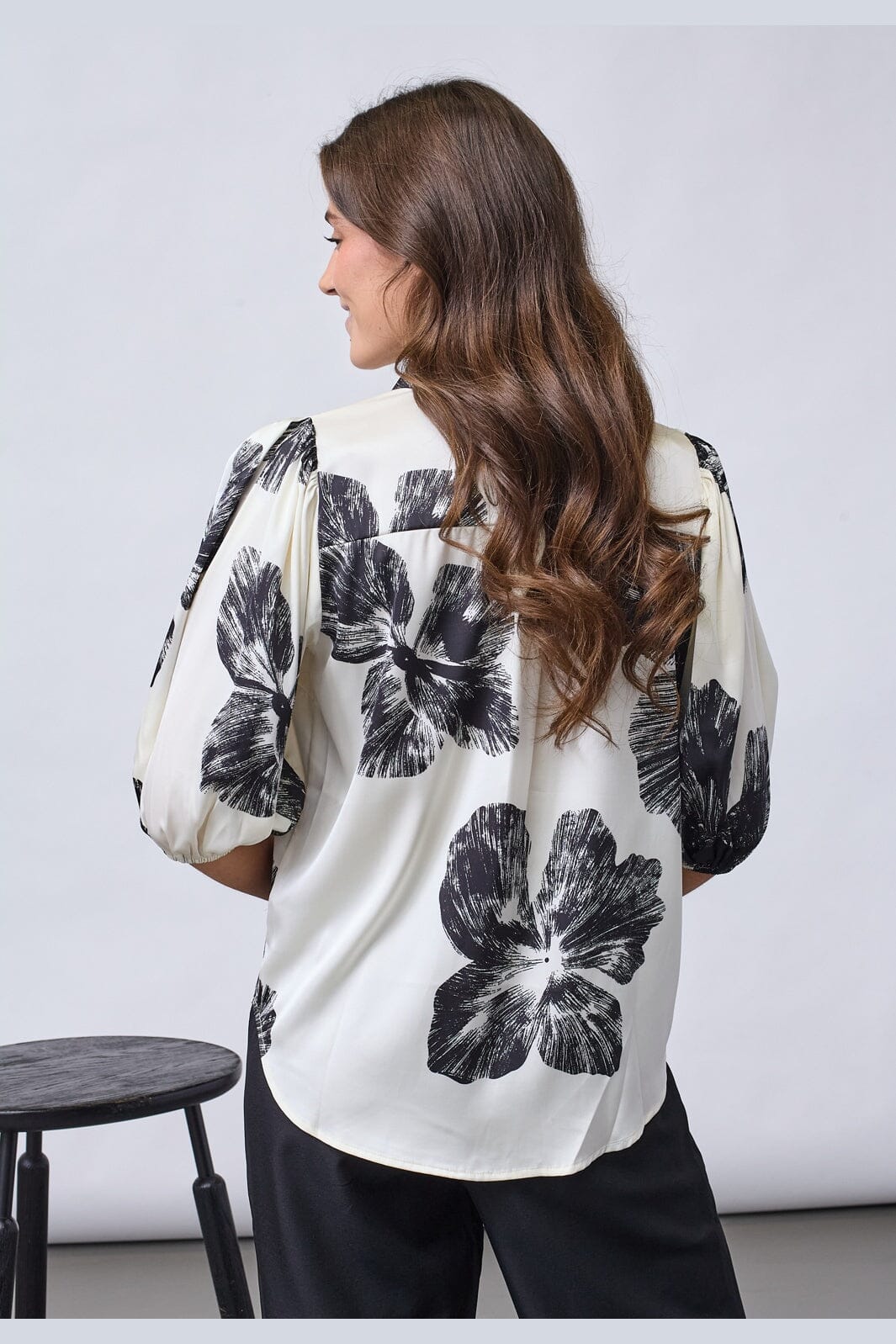 Eine Satinsbluse von Sisters Point mit grafischem Blumenprint in Schwarz auf cremefarbenem Hintergrund. Die Bluse hat eine lockere Passform.