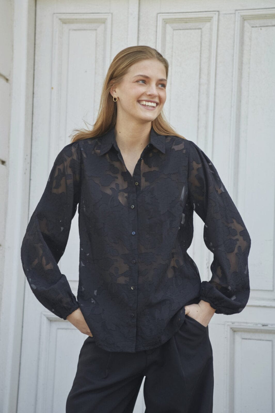 Schwarzes Hemd von Sisters Point mit transparentem Blumenmuster aus Spitze. Das Hemd hat eine lockere Passform mit klassischem Kragen und Knopfleiste vorne. Die langen Ärmel enden mit Manschetten.