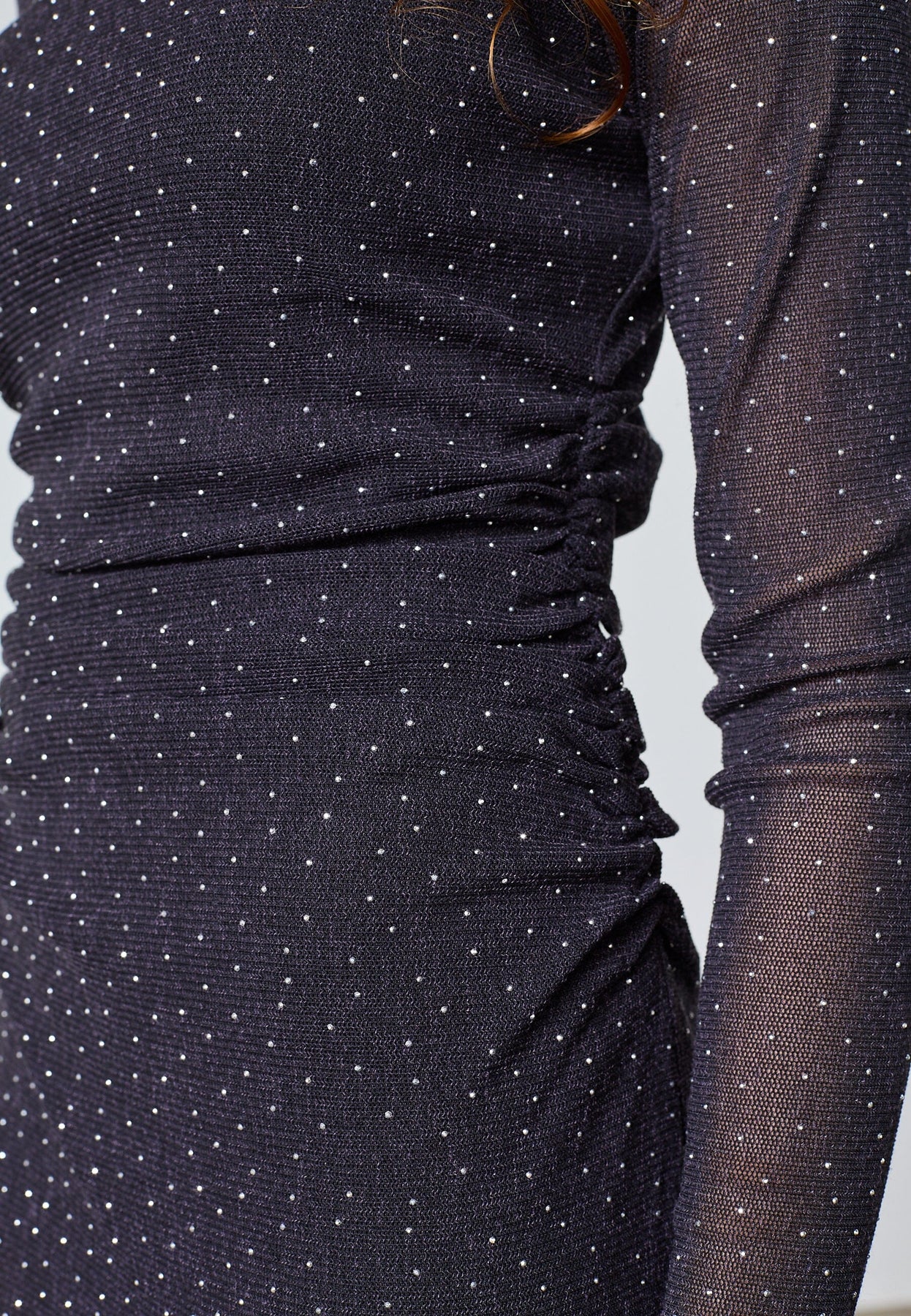 Schwarzes Kleid von Sisters Point mit silberfarbenen Punkten. Es hat lange Ärmel und einen runden Ausschnitt. Das Kleid reicht bis zur Mitte der Wade und hat Rüschendetails an den Seiten.