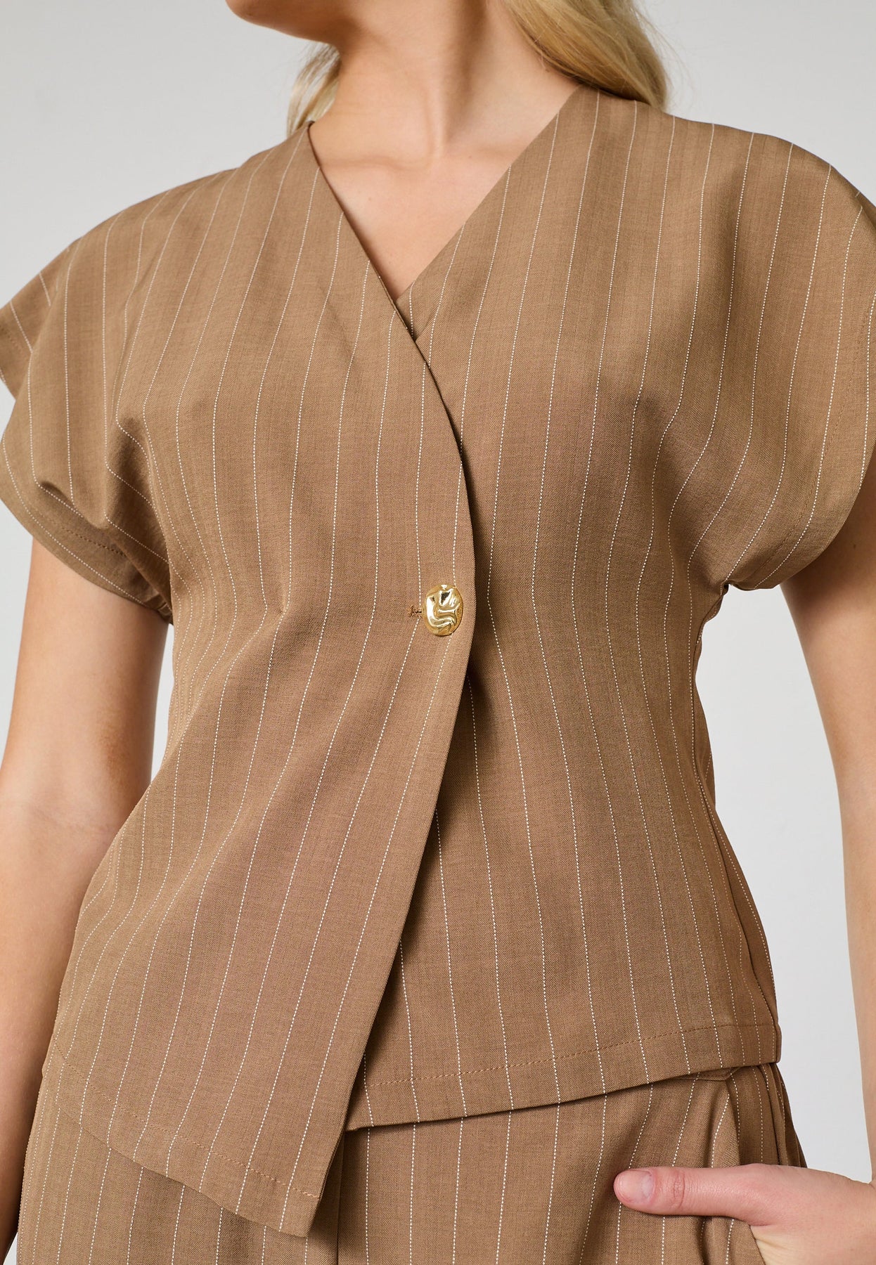 Bluse von Sisters Point in Beige mit feinen, vertikalen Pinstripe-Streifen. Die Bluse hat kurze, weite Ärmel und einen Wickeleffekt mit einem goldfarbenen Knopf.