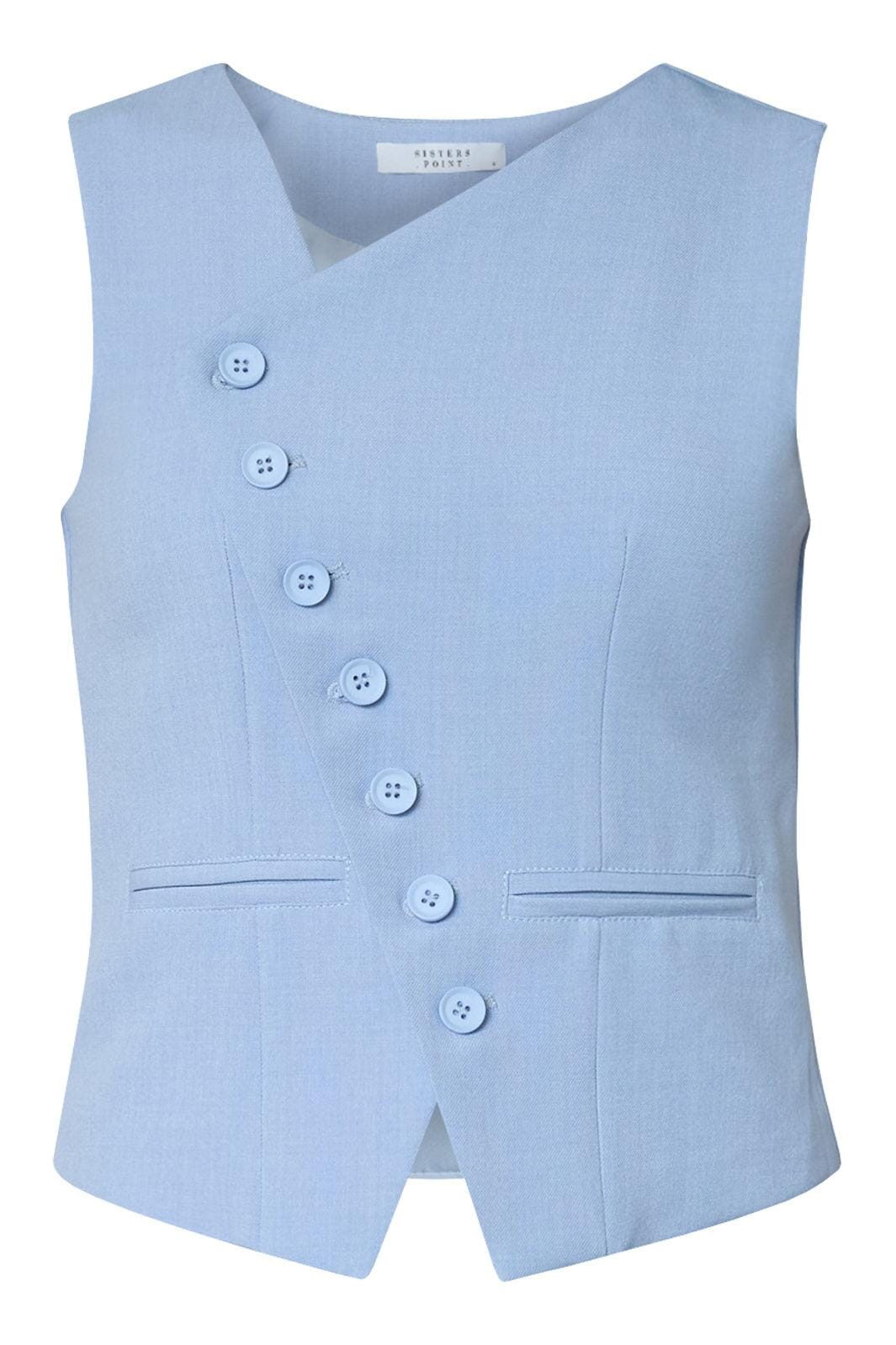 Eine hellblaue Weste von Sisters Point mit asymmetrischer Knopfleiste und V-Ausschnitt. Die Weste hat sechs Knöpfe entlang der Vorderseite und zwei dekorative Taschen.