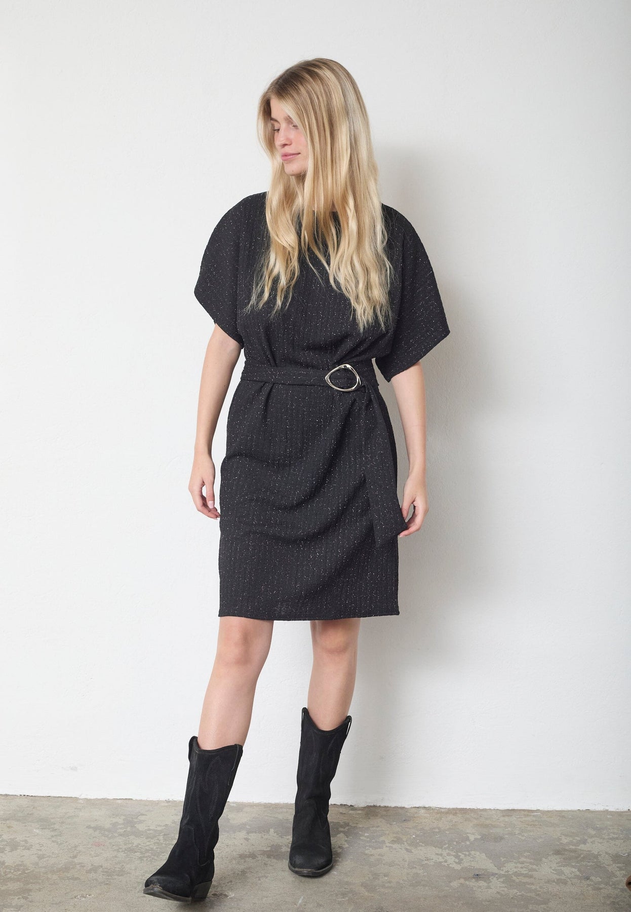 Schwarzes Kleid von Sisters Point mit silberfarbenen Fäden. Das Kleid hat kurze Fledermausärmel, einen runden Halsausschnitt und eine oberschenkellange Länge. Es hat eine lockere Passform und einen mitgelieferten Gürtel.