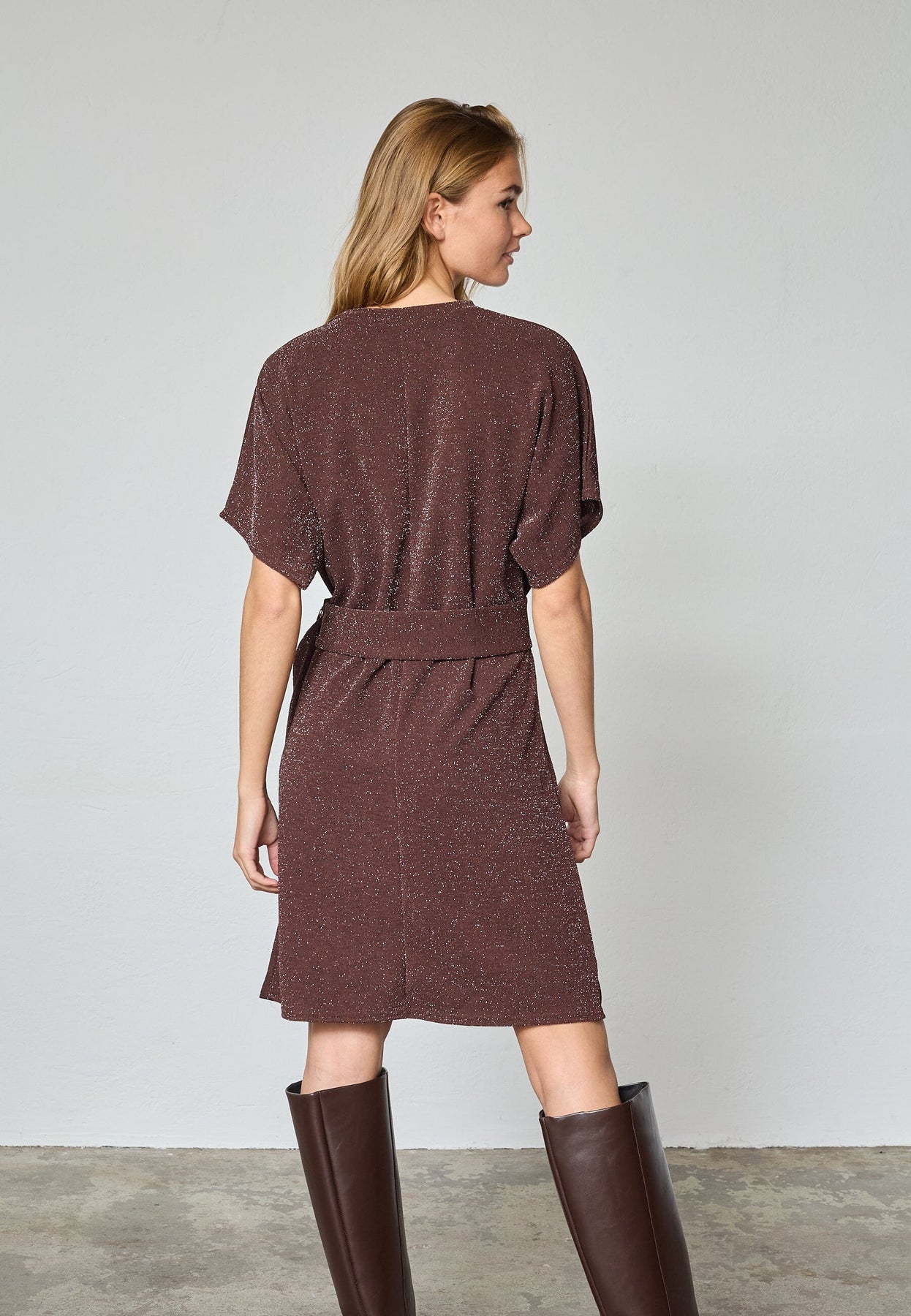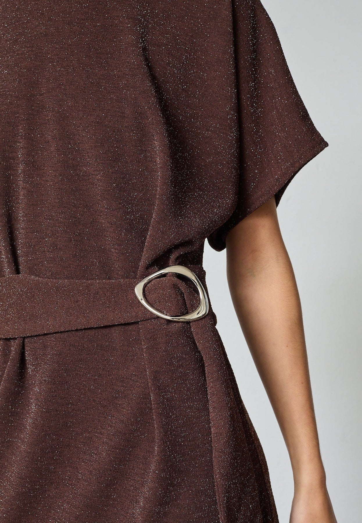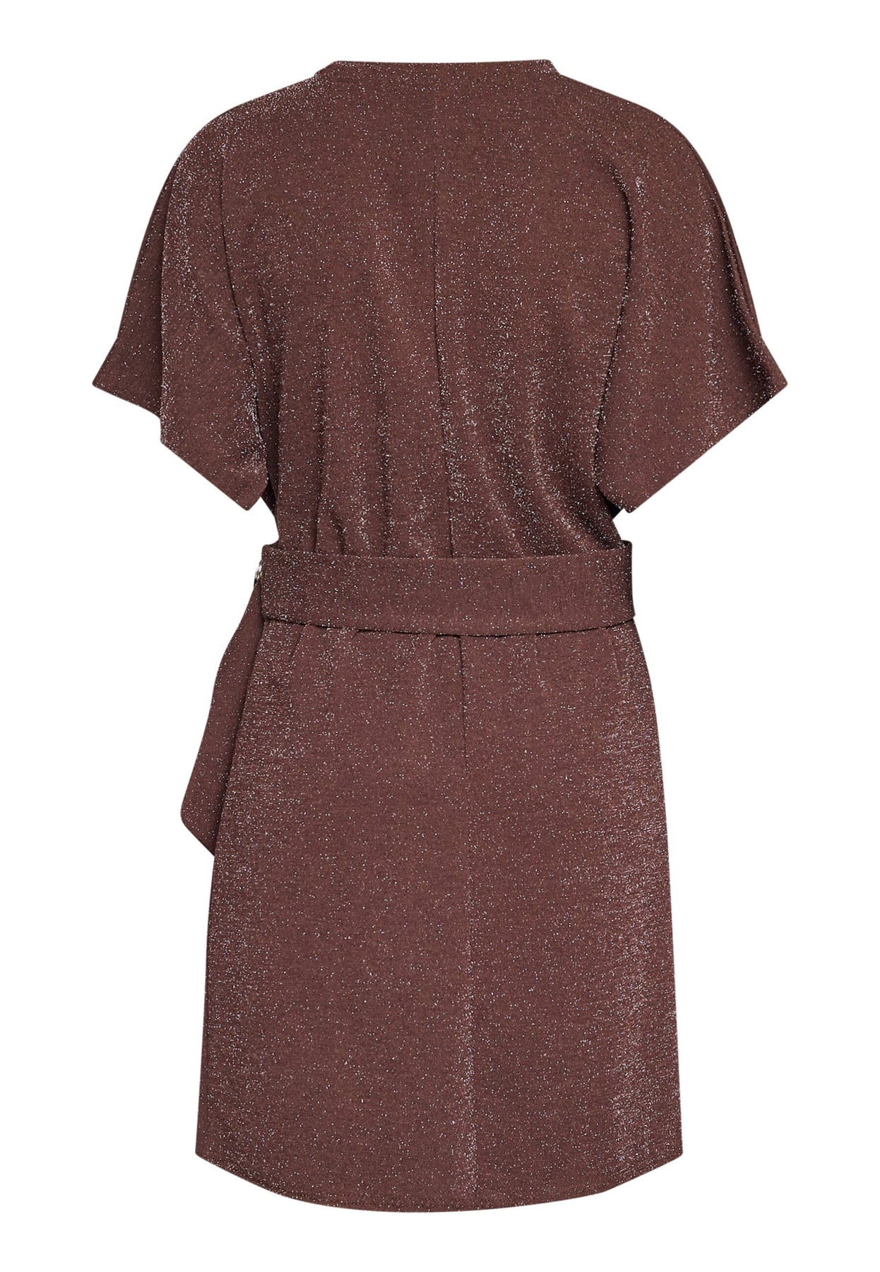Braunes Kleid von Sisters Point mit einer strukturierten Oberfläche, bei der glänzende silberfarbene Fäden dem Kleid einen festlichen Ausdruck verleihen.