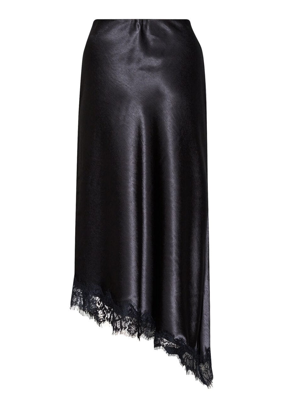 Schwarzer Rock von Sisters Point mit glänzender Satinoptik aus gewebtem Polyester. Der Rock hat einen asymmetrischen Schnitt mit einem schrägen Saum, der mit Spitze verziert ist.