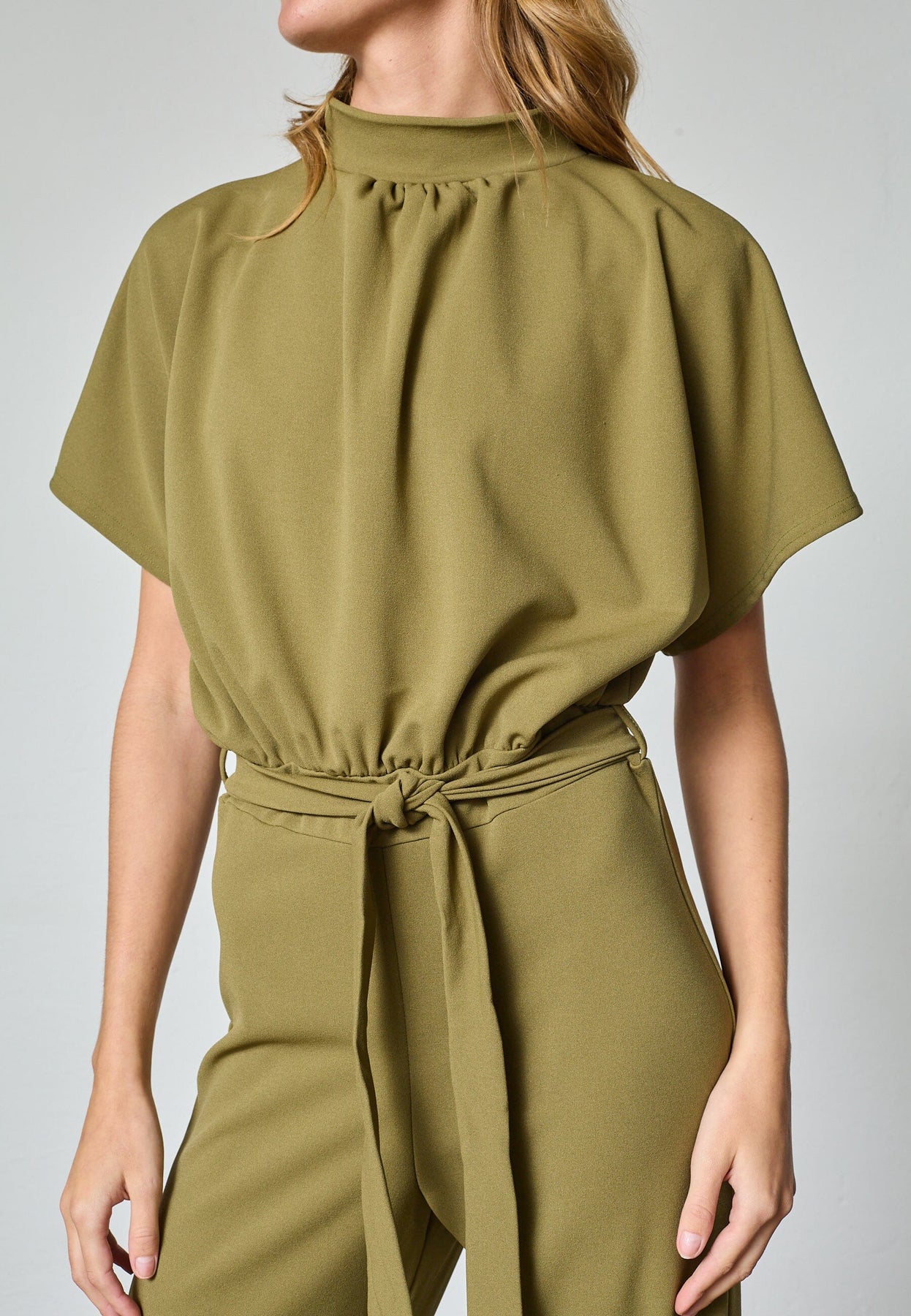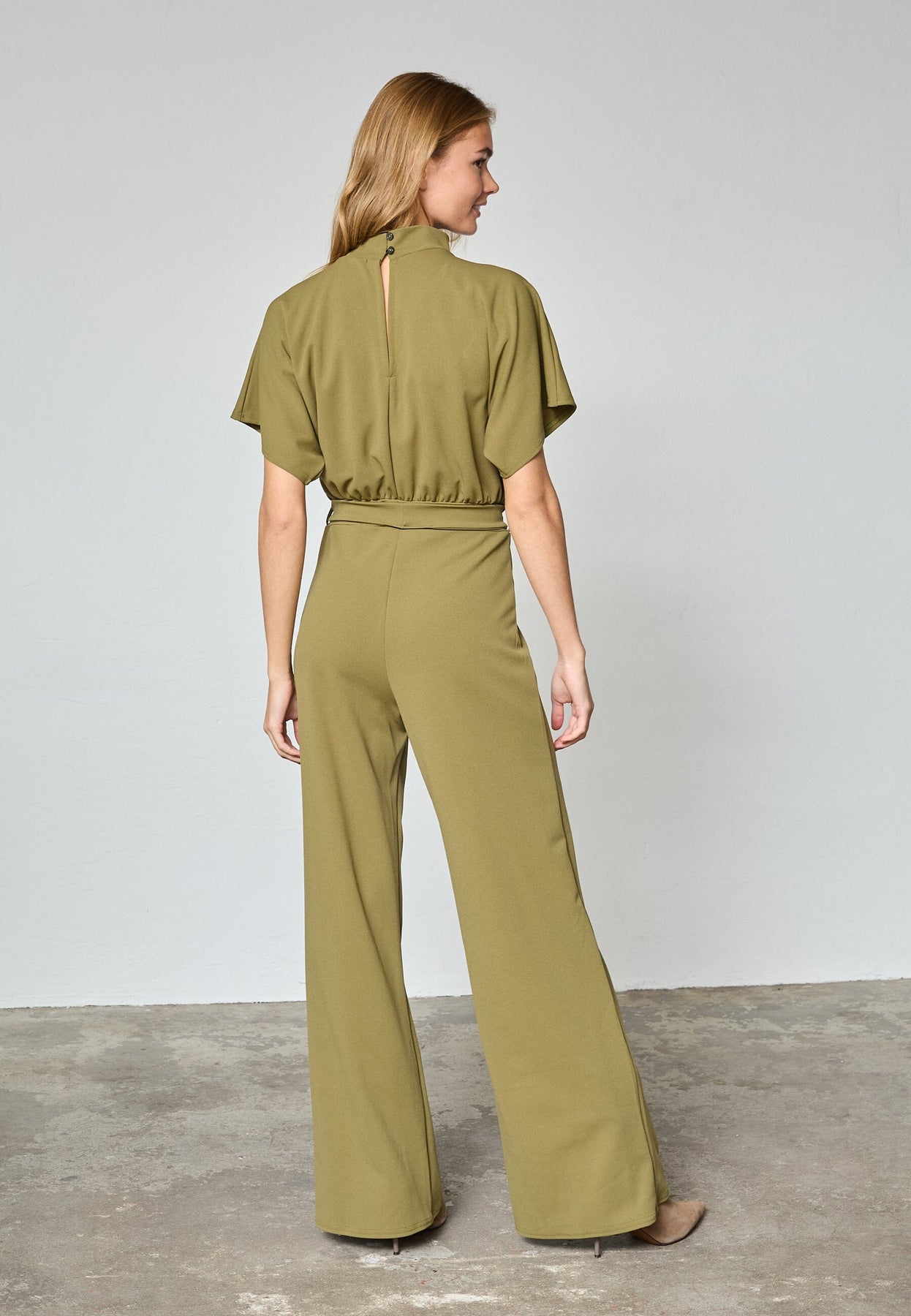 Jumpsuit von Sisters Point in einem khakigrünen Farbton. Das Material besteht aus 95% Polyester und 5% Elasthan, und der Jumpsuit hat eine lockere Passform mit bodenlanger Länge.
