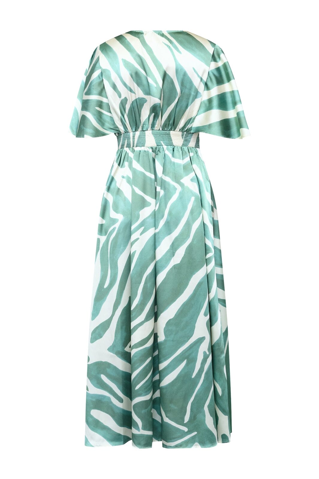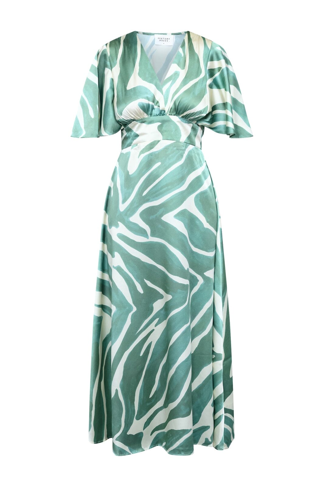 Kleid von Sisters Point mit einem grünen und weißen grafischen Muster. Das Kleid hat eine knöchellange Länge, kurze Ärmel und einen V-Ausschnitt.