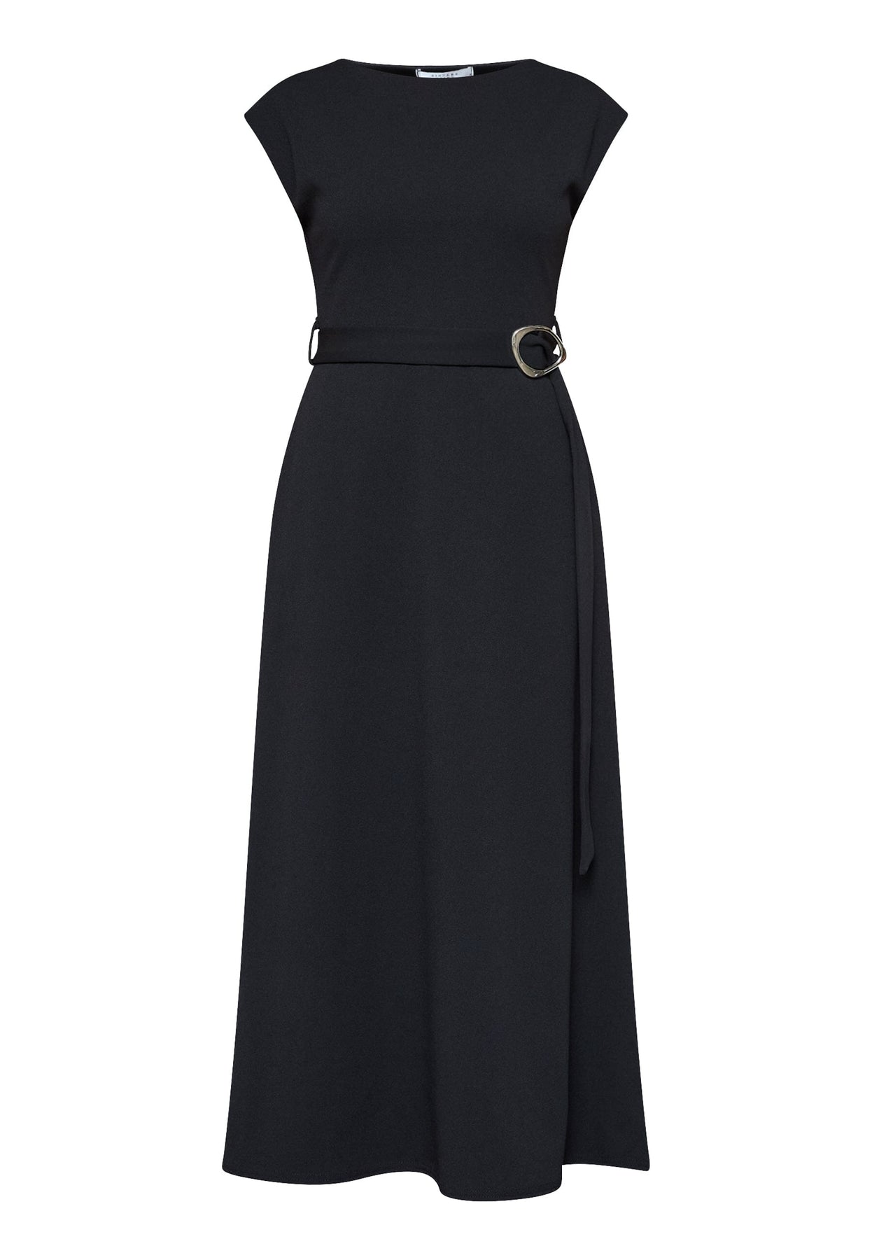 Schwarzes Kleid von Sisters Point aus glattem Polyester mit fest angenähtem Taillengürtel und großer, runder Schnalle vorn.