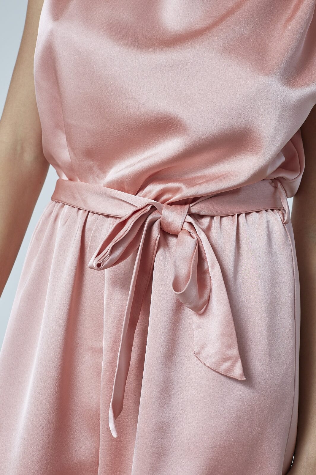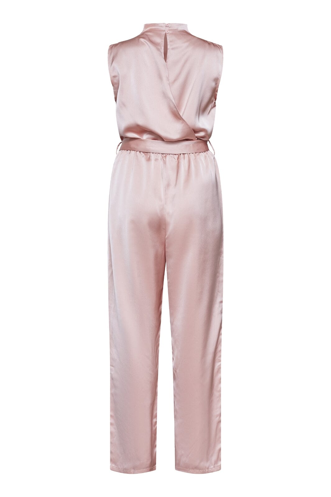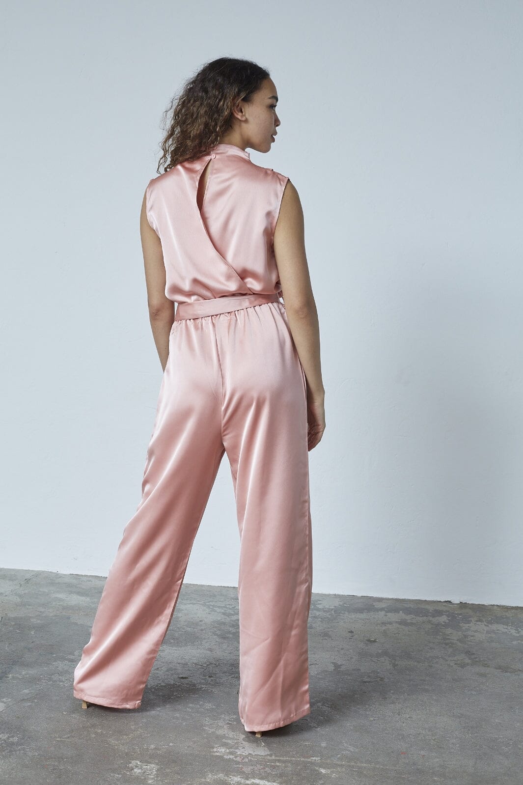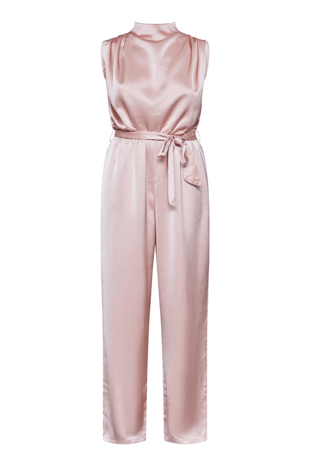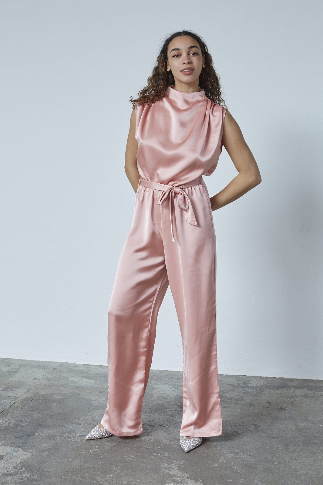 Ärmelloser Jumpsuit aus Satin in korallenrosa. Er hat einen hohen Halsausschnitt, einen Rückenausschnitt und ein Bindeband in der Taille zur Anpassung der Passform.