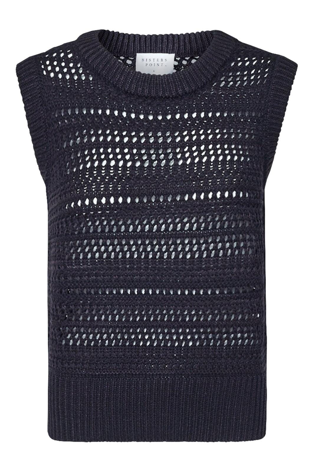 Schwarze ärmellose Weste von Sisters Point mit einem Lochmuster aus gestrickter Acryl- und Baumwollqualität. Die Weste hat einen Rundhalsausschnitt und eignet sich für den Alltag.