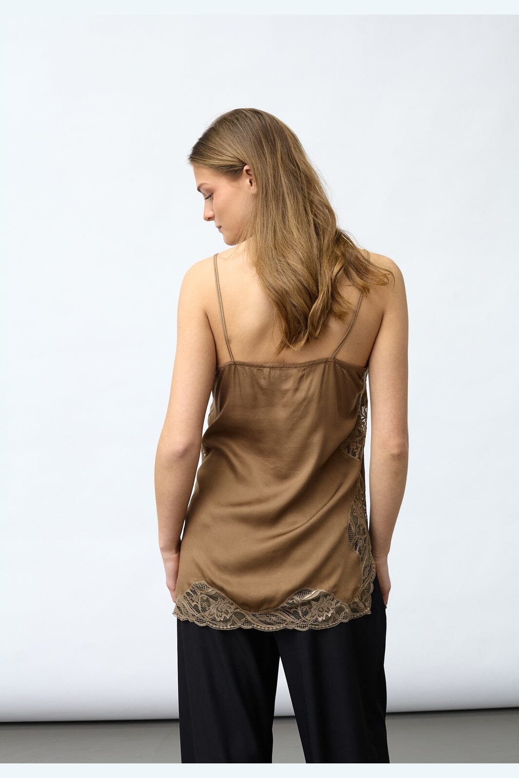 Braunes Top von Sisters Point mit V-Ausschnitt und Spitzenkanten. Das Top hat dünne Träger und eine lockere Passform, die die Hüften bedeckt.