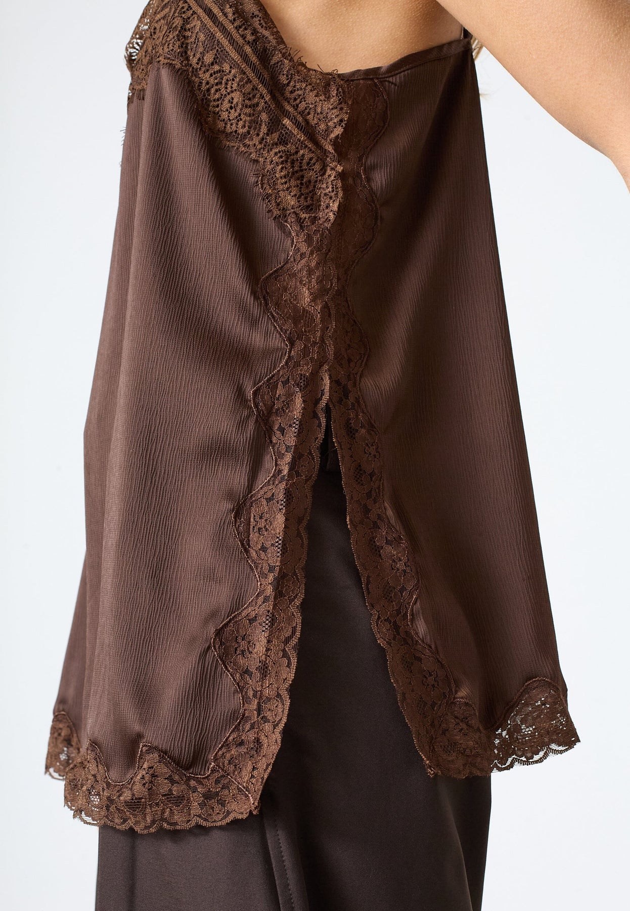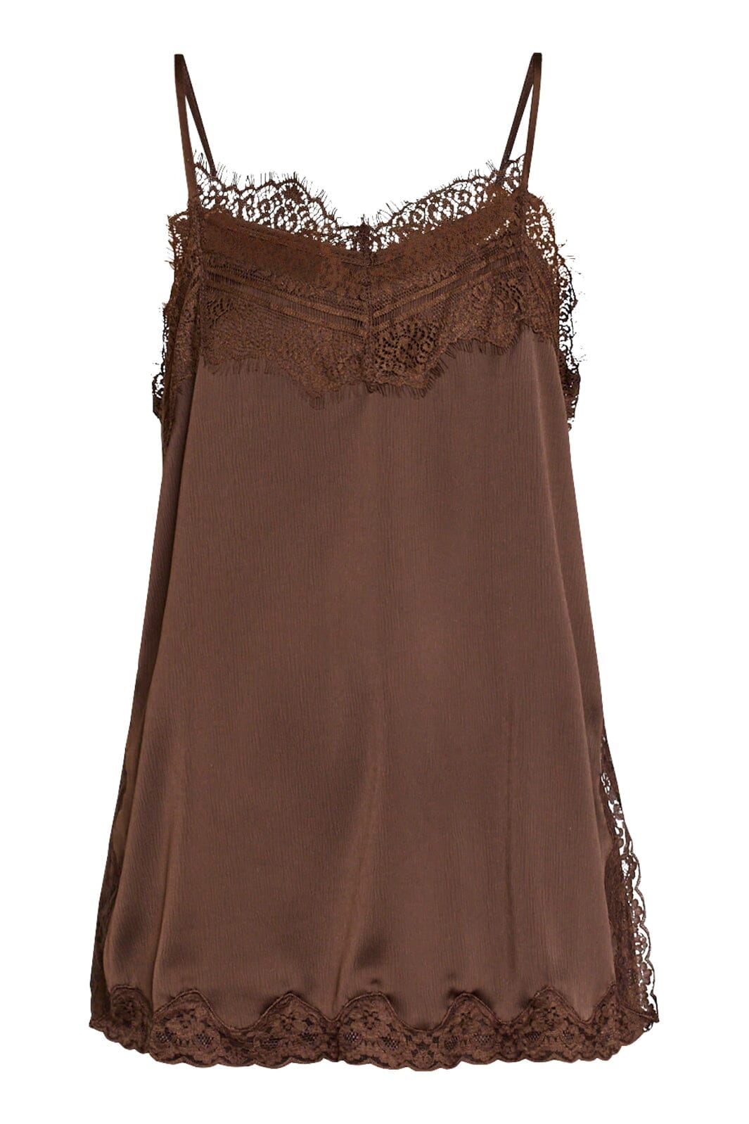 Braunes Top von Sisters Point mit Spaghettiträgern und Spitzendetails. Das Top hat einen V-Ausschnitt und eine lockere Passform aus 100 % Polyester.
