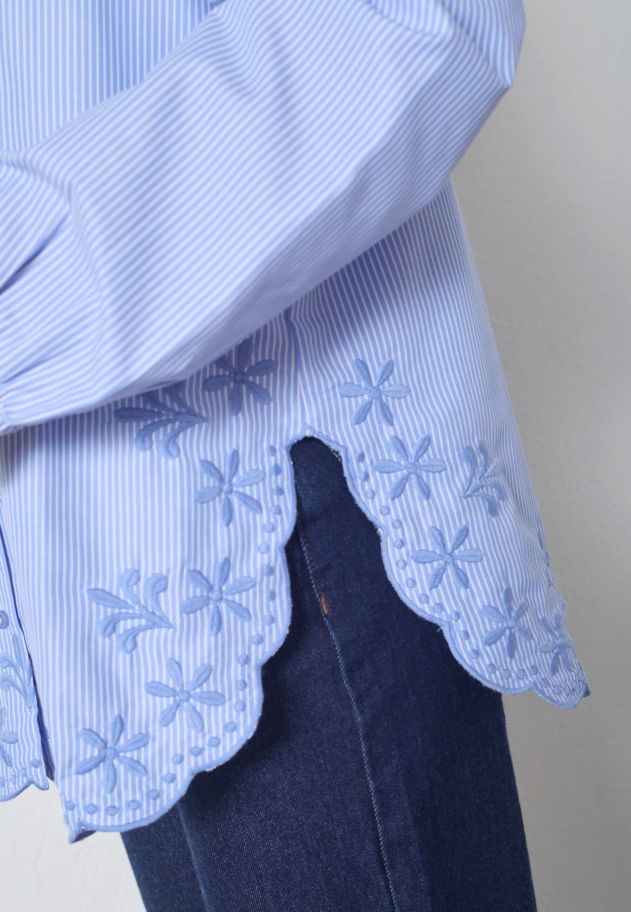 Gestreiftes Hemd von Sisters Point mit hellblauen und weißen Streifen. Das Hemd hat entlang des unteren Saums gestickte Blumen.