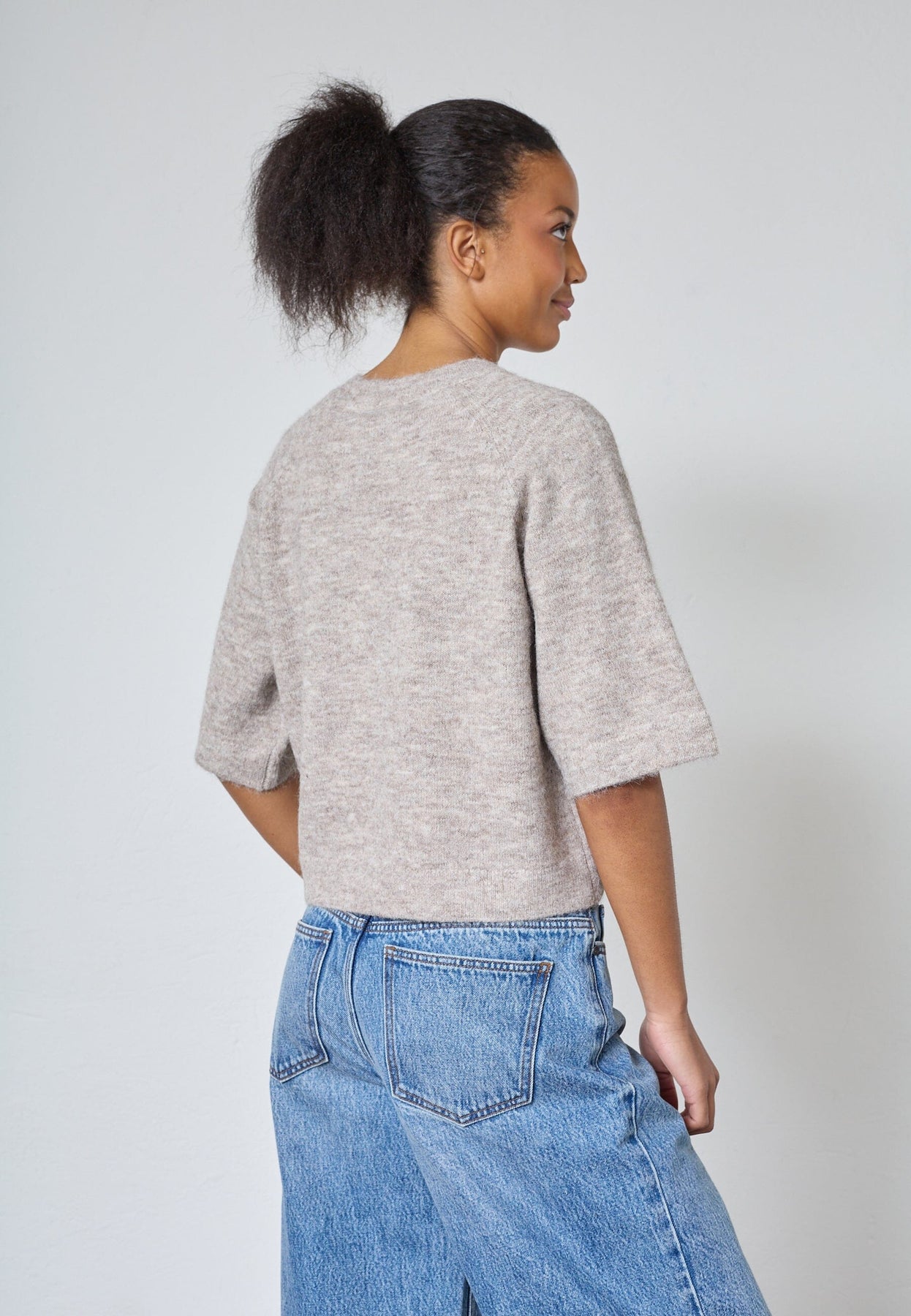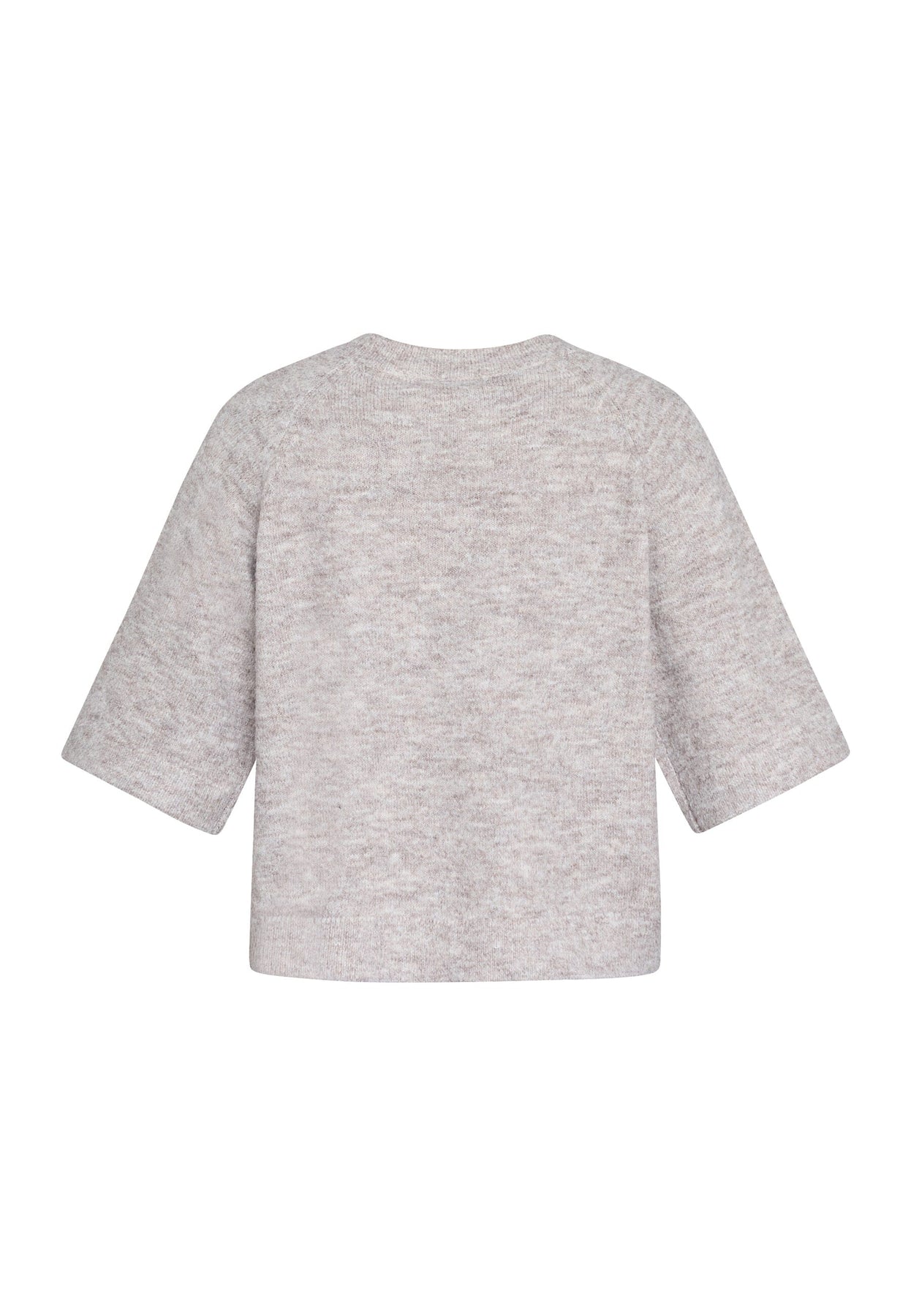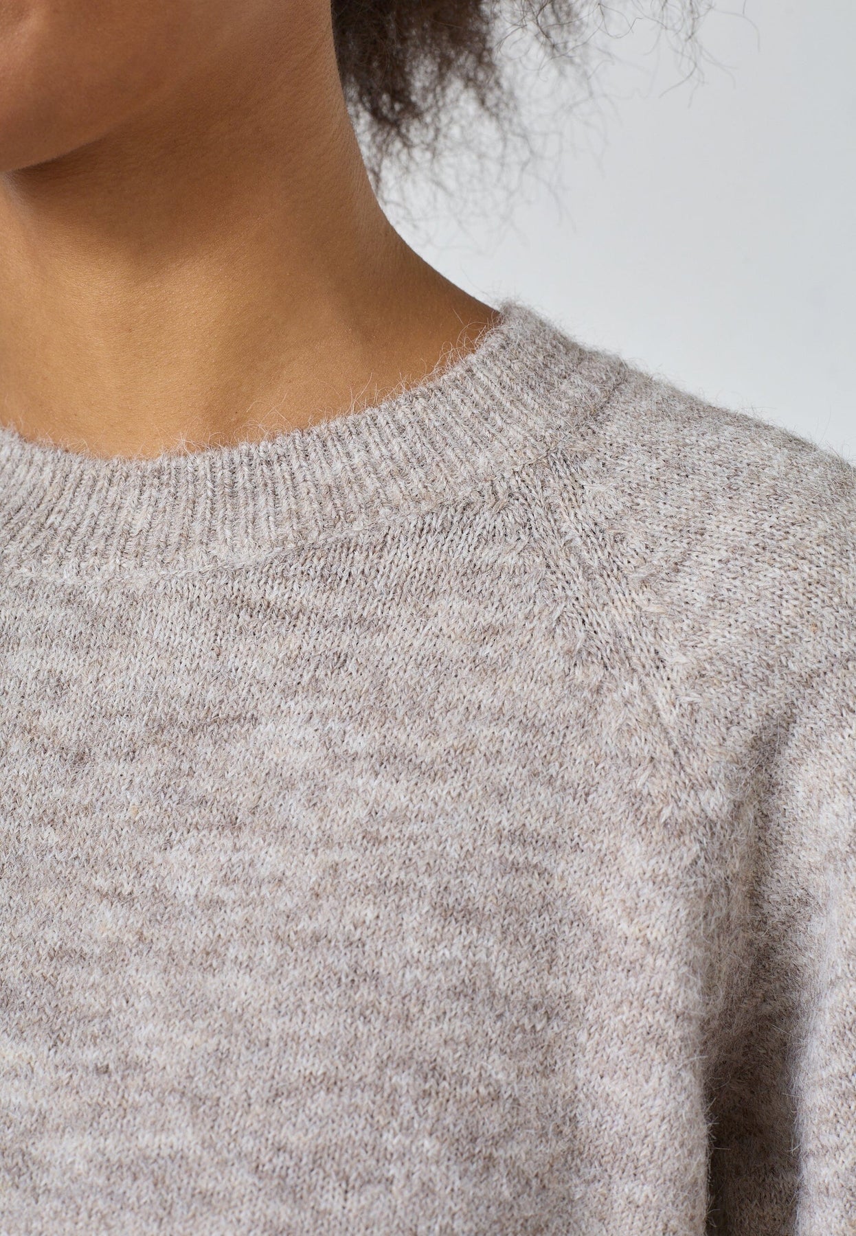 Strickpullover von Sisters Point aus meliertem Garn. Die Farbe ist ein neutraler Beige-Sand-Ton. Der Pullover hat eine lockere Passform mit Weite im Rumpf.