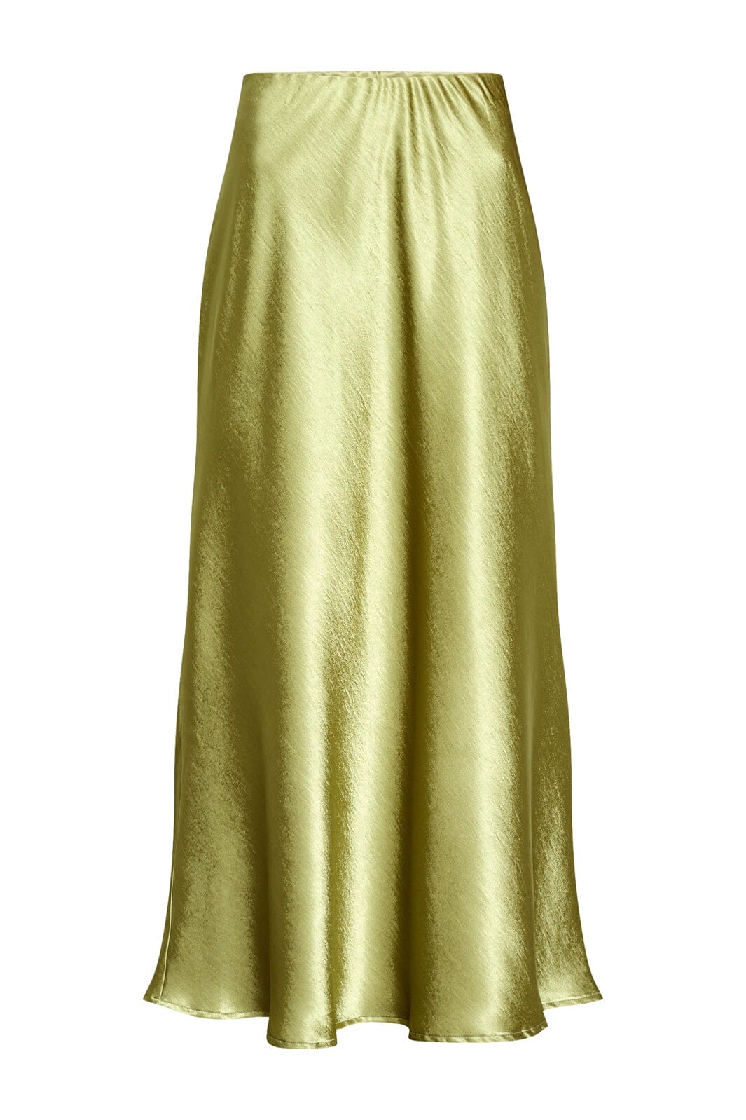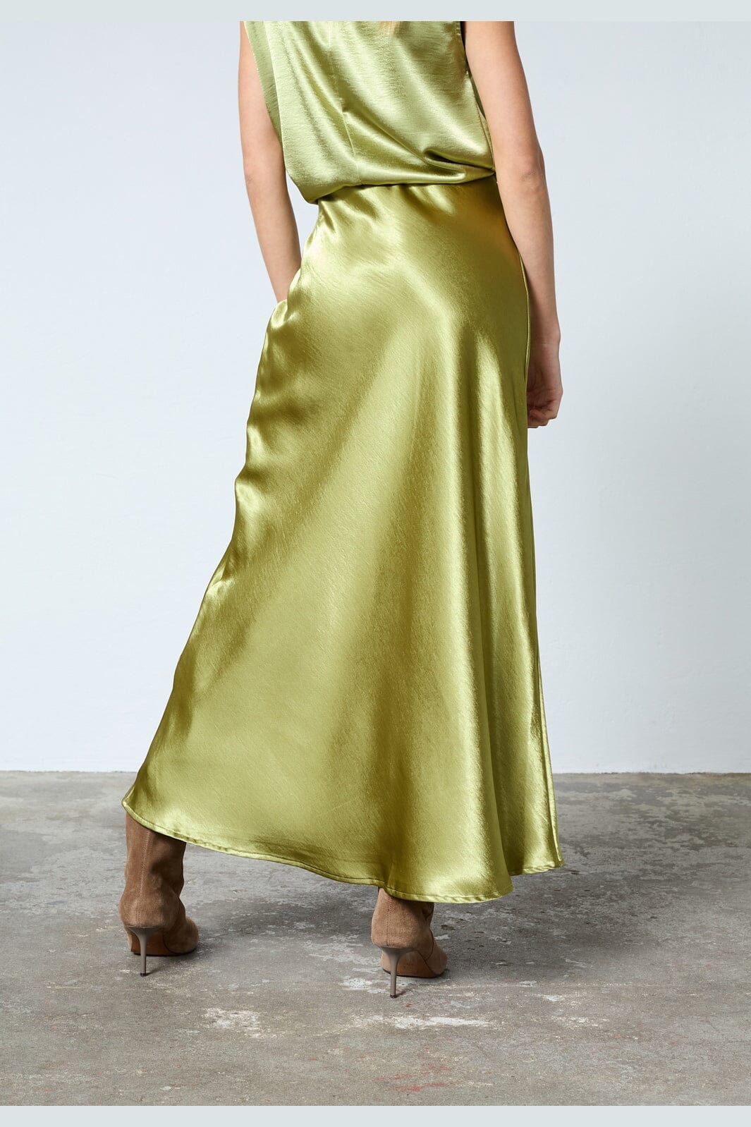 Langer Rock von Sisters Point aus limettengrünem Satin. Der Rock hat eine fließende A-Linien-Passform und eine glänzende Oberfläche.