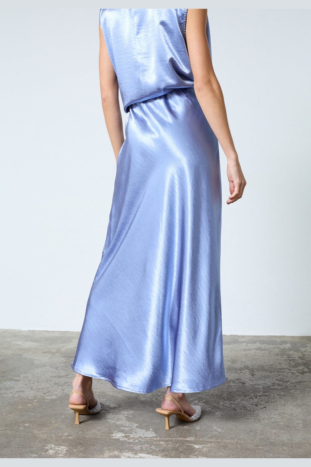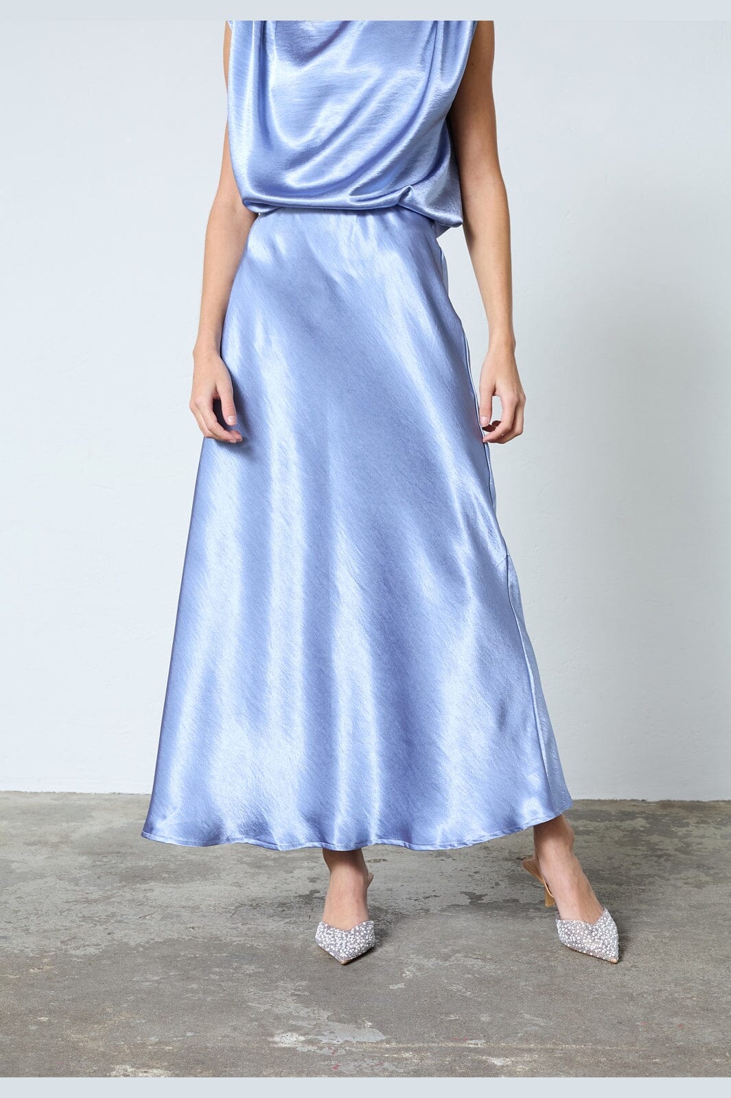 Midblauer Rock von Sisters Point, aus Satin mit A-Linien-Schnitt. Der Rock hat eine glänzende Oberfläche und reicht bis zur Wade.