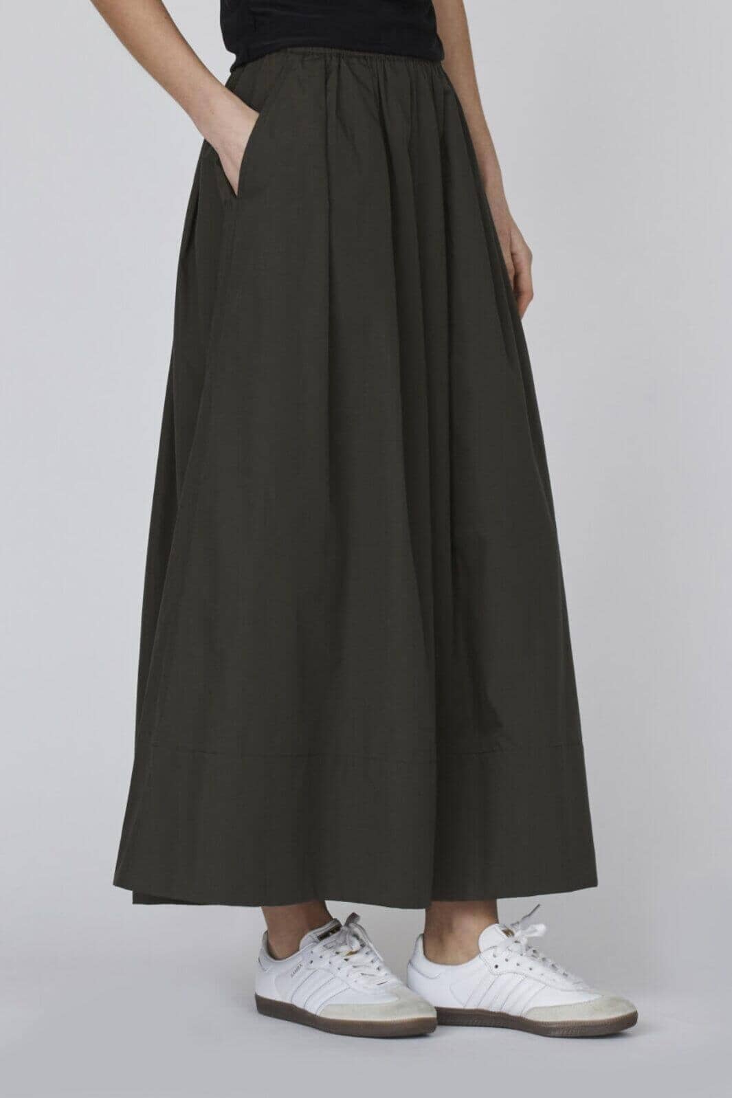 Lange Rock von Sisters Point in Khaki. Sie hat eine lockere Passform und einen elastischen Bund mit Taschen an den Seiten.