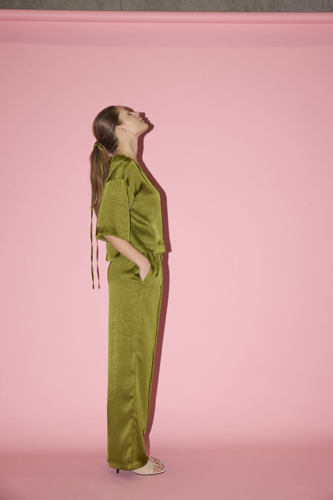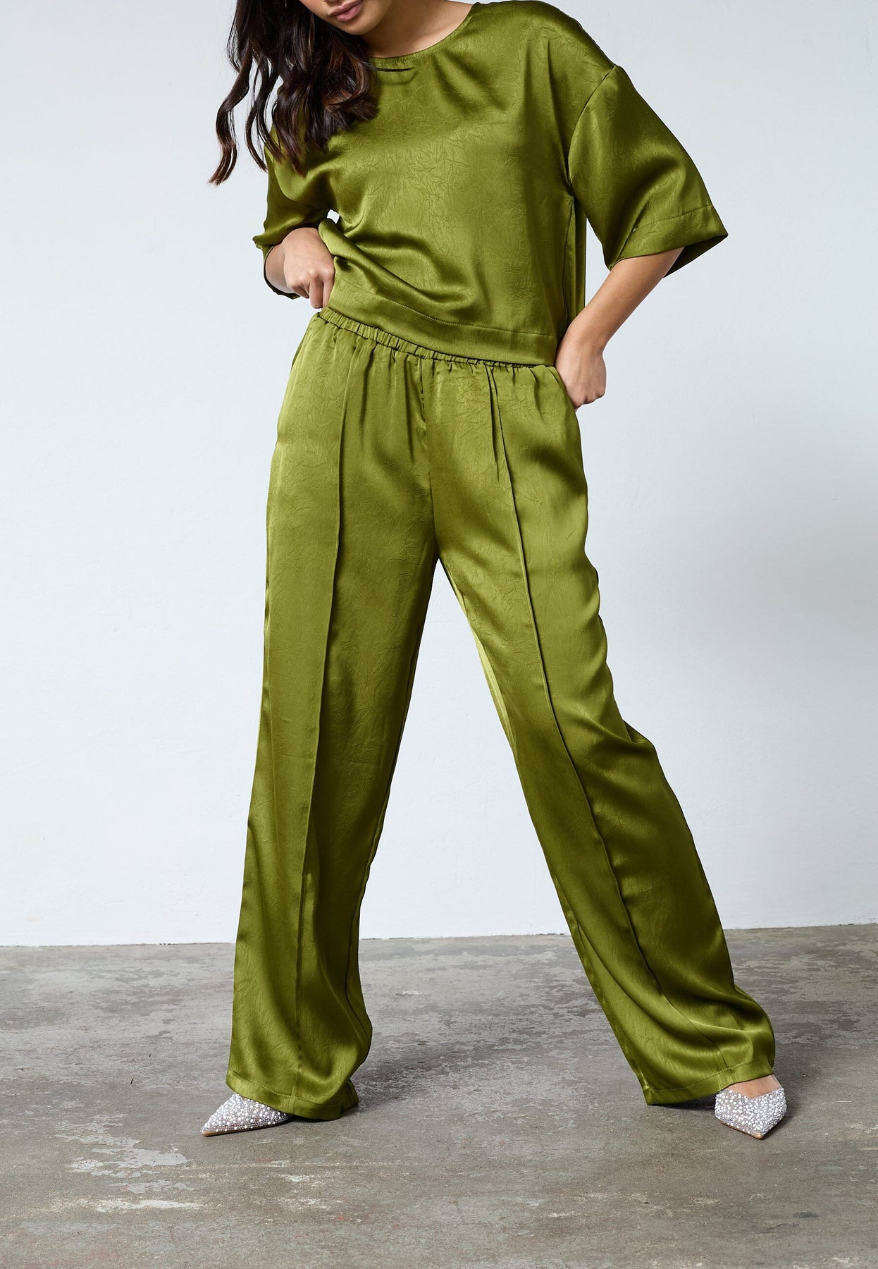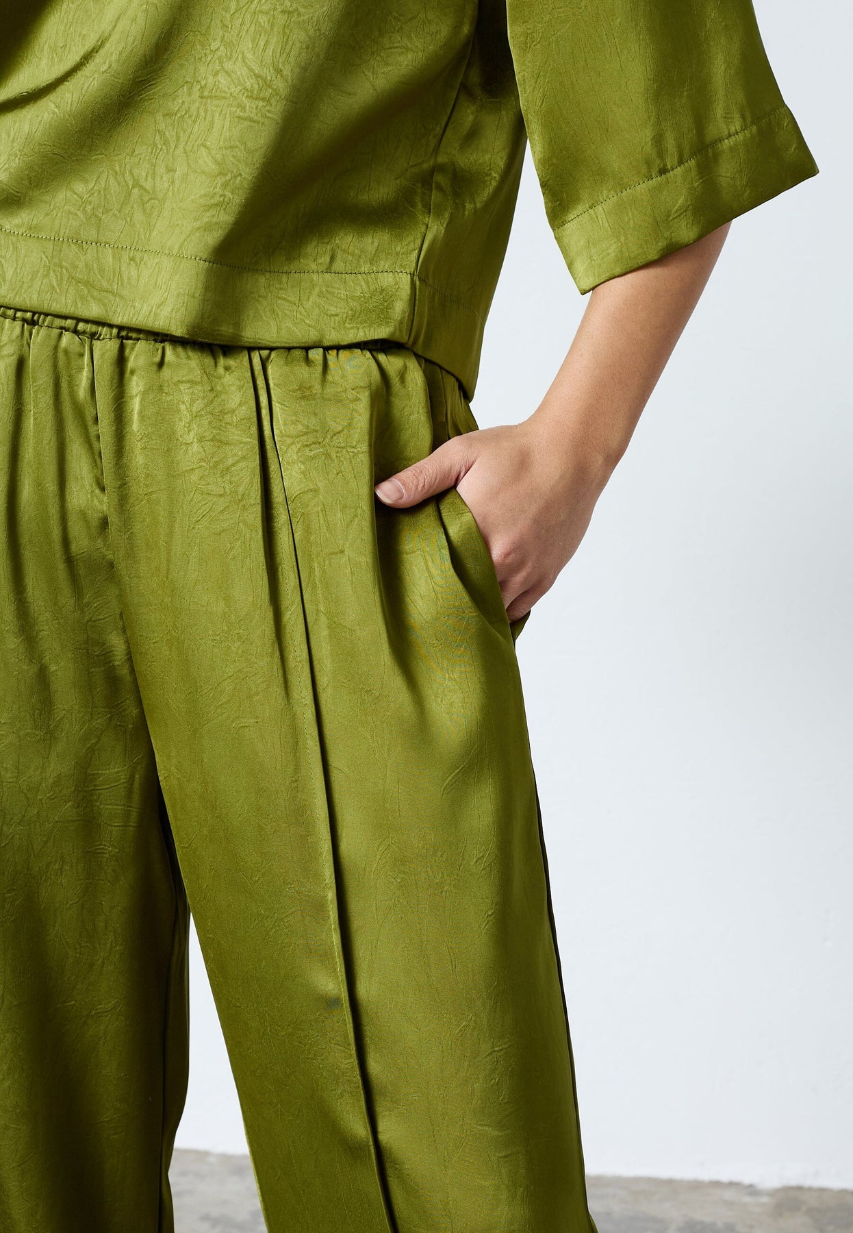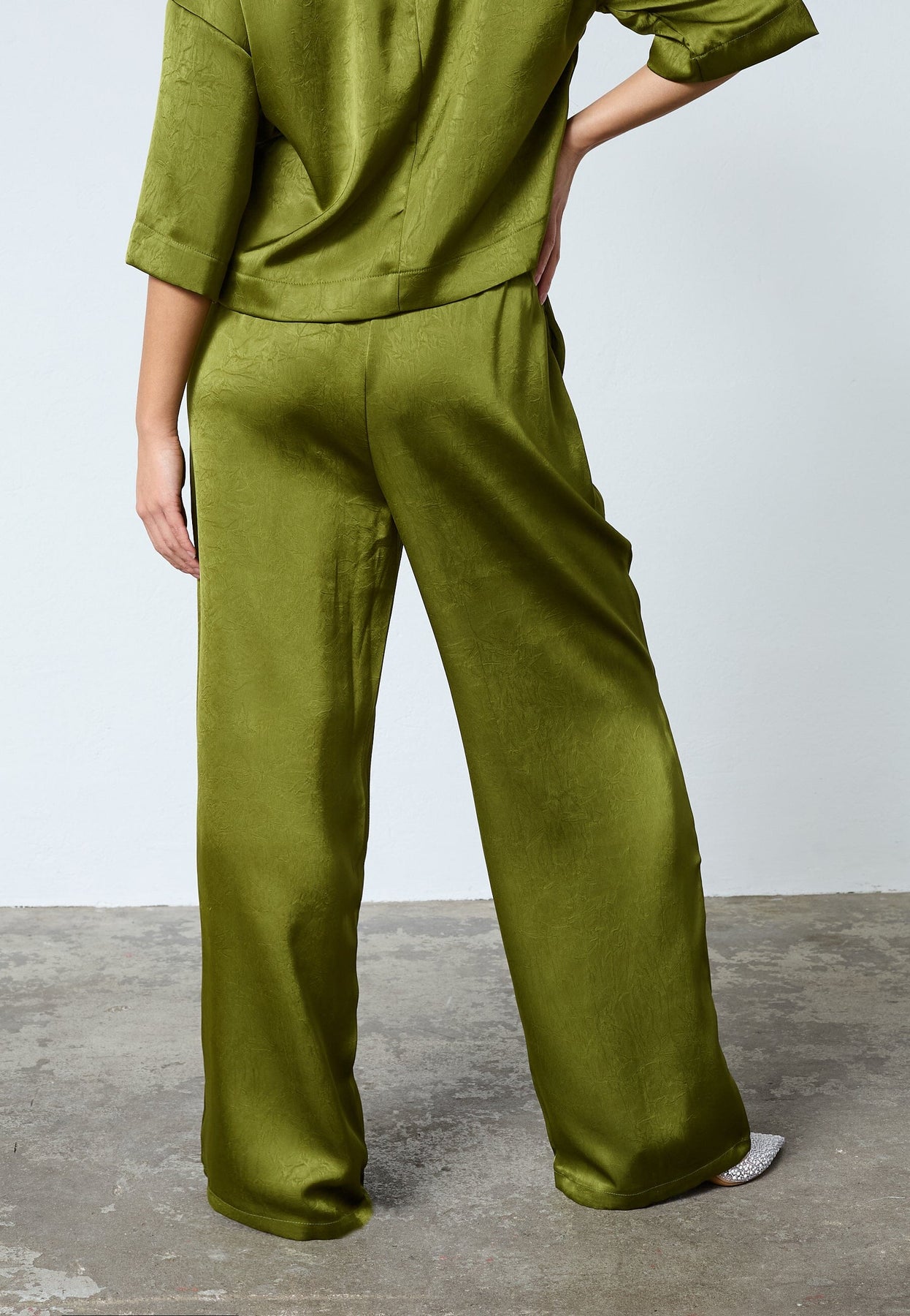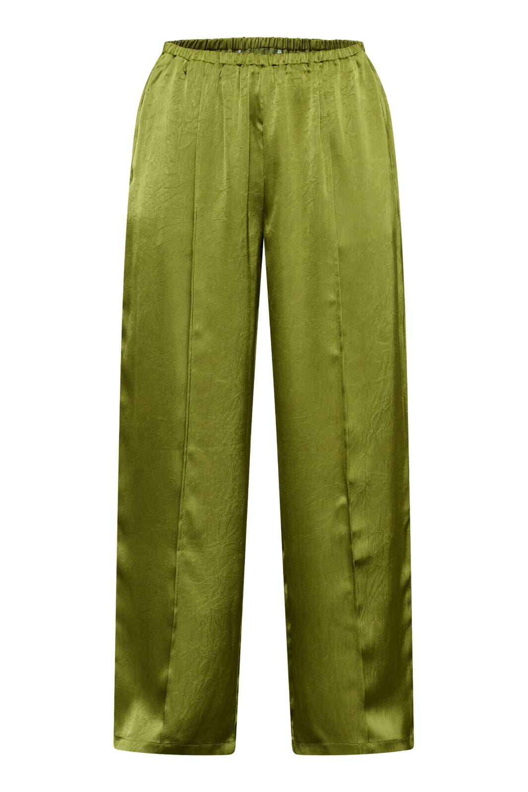 Grüne Hose von Sisters Point aus 100 % Polyester mit Satinoptik. Die Hose hat eine lockere Passform und einen elastischen Bund.