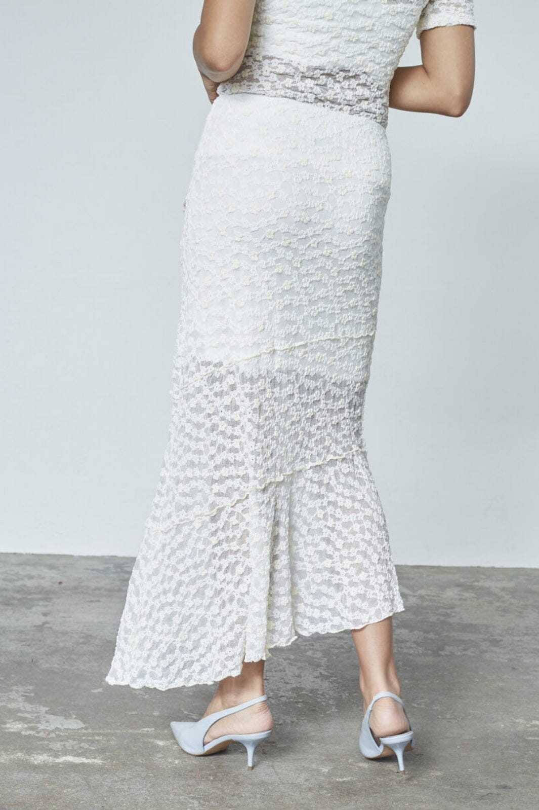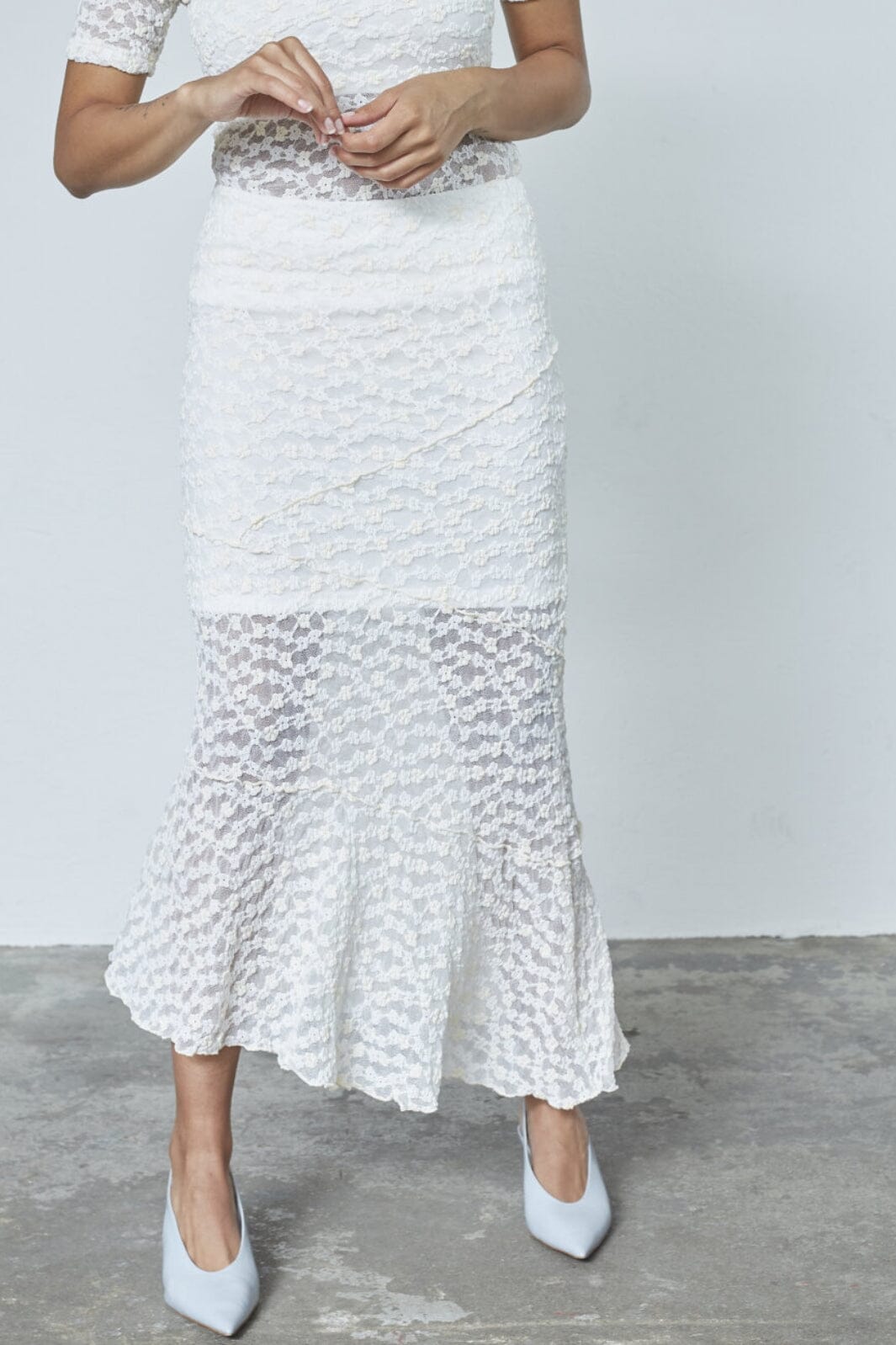 Wadenlange Rock in Creme mit Spitzenmuster und Volantkante unten. Die hohe Taille und die schmale Passform sorgen für eine schöne Silhouette, und das innere Futter sorgt für einen schönen Fall.