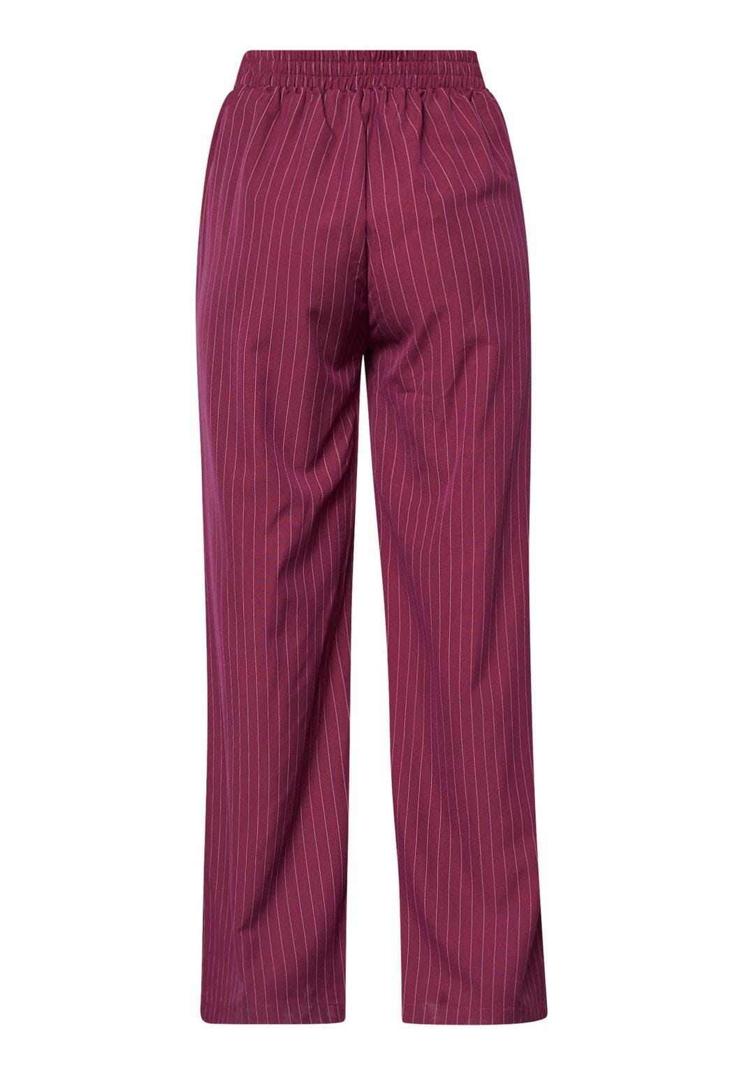 Hose von Sisters Point in Bordeaux und Creme mit vertikalen Nadelstreifen. Die Hose hat eine lockere Passform, bodenlange Beine und einen elastischen Bund.