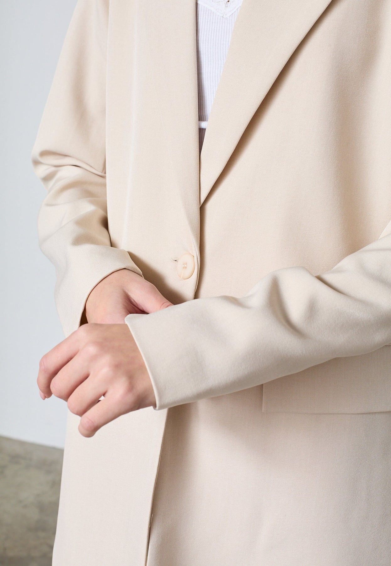 Heller Blazer von Sisters Point in der Farbe Fog, einem neutralen Beigeton. Der Blazer hat ein Reverskragen, einen Knopfverschluss vorne und zwei Taschen.