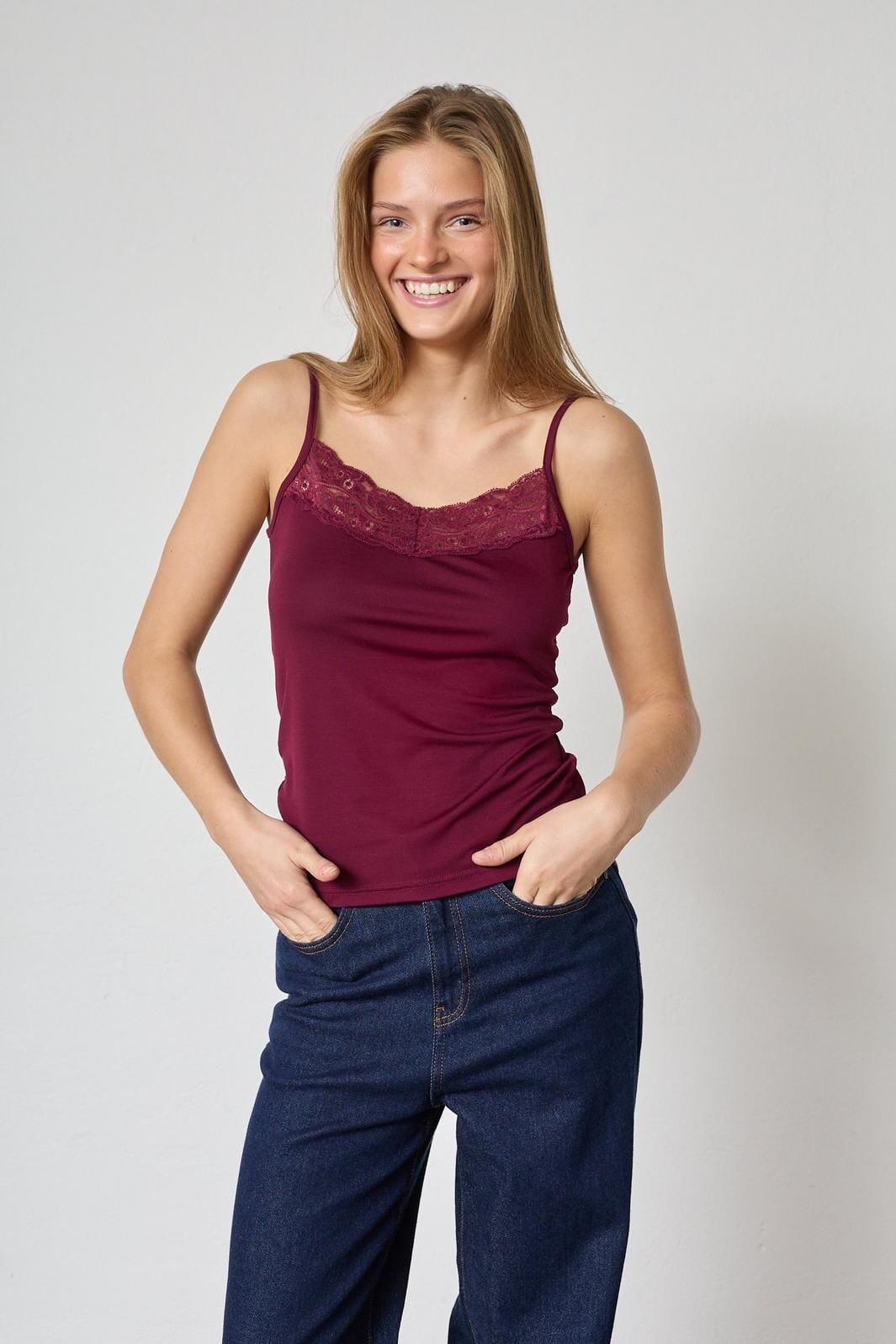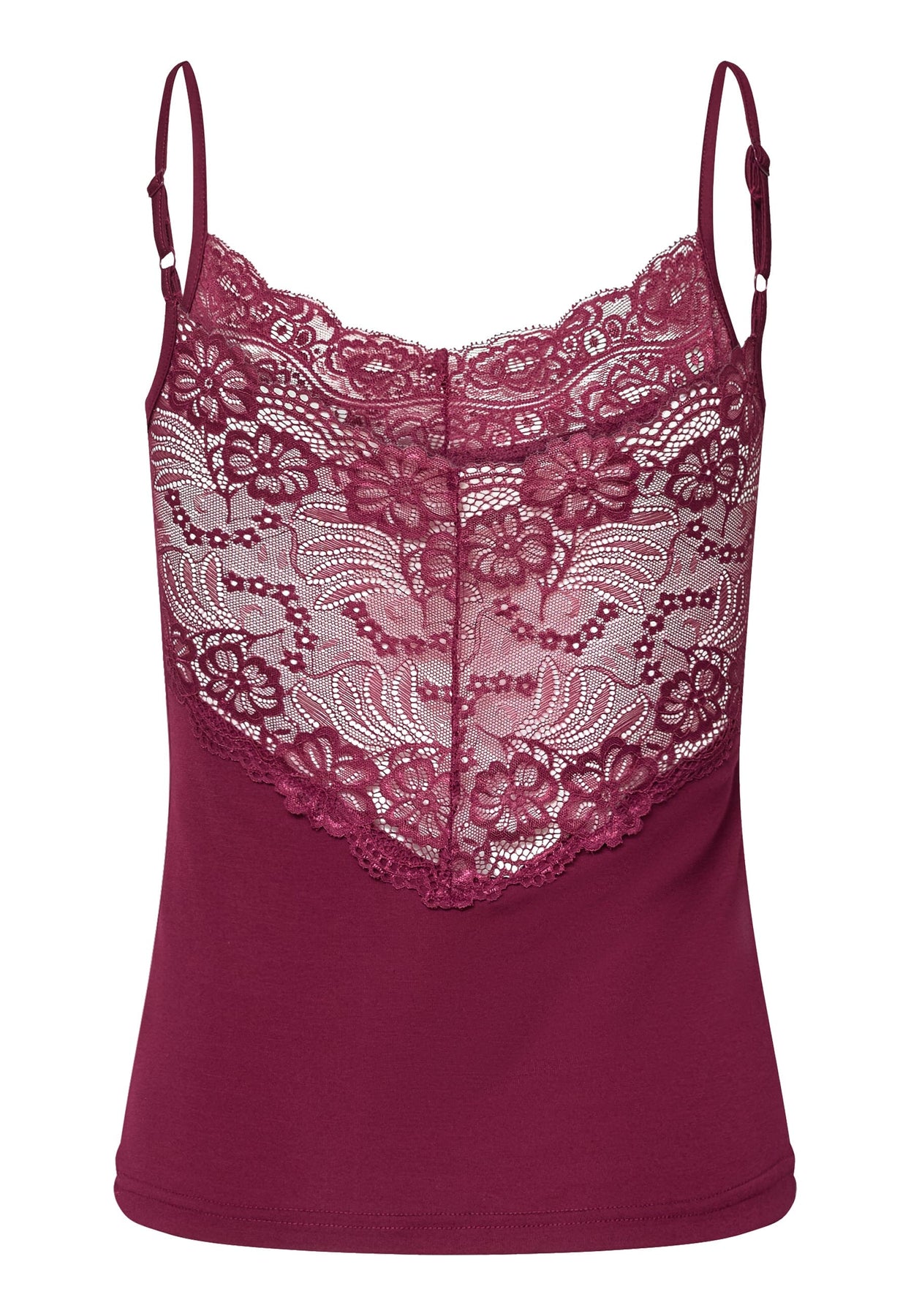 Top von Sisters Point in tiefem Bordeauxrot mit Spitzendetails am Halsausschnitt. Das Top hat verstellbare Spaghettiträger und eine figurbetonte Passform.