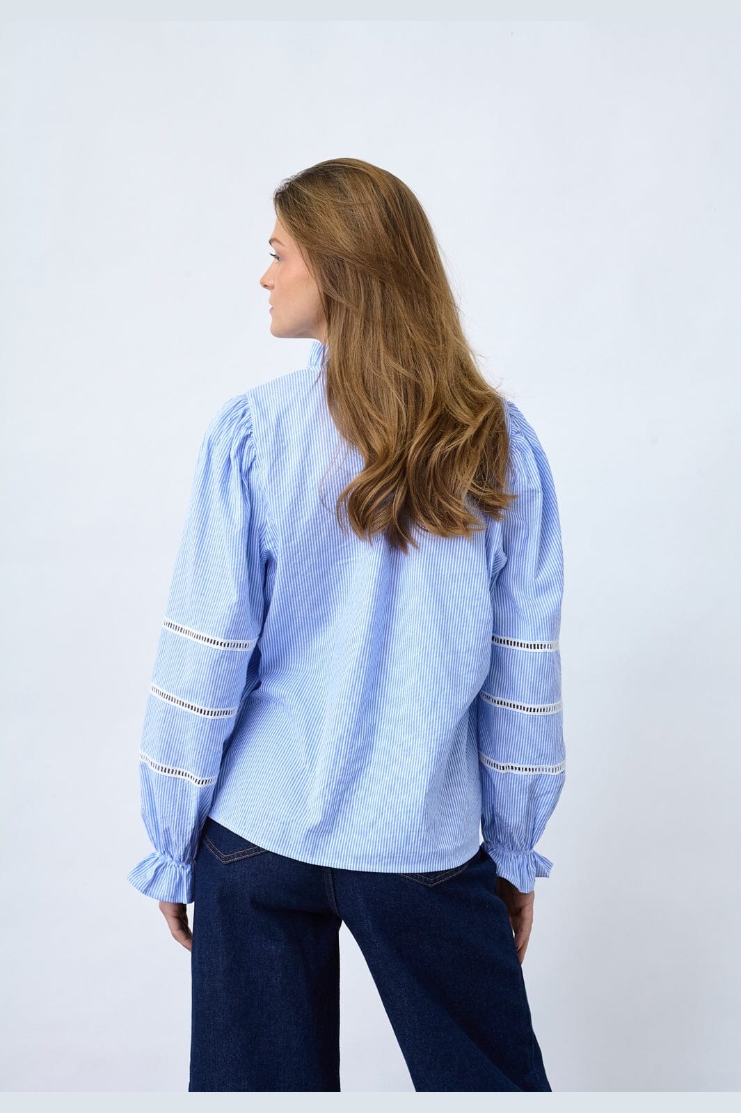 Bluse von Sisters Point in Blau und Weiß mit Streifen. Die Bluse ist ein Pullover mit hohem Halsausschnitt und langen Ärmeln.
