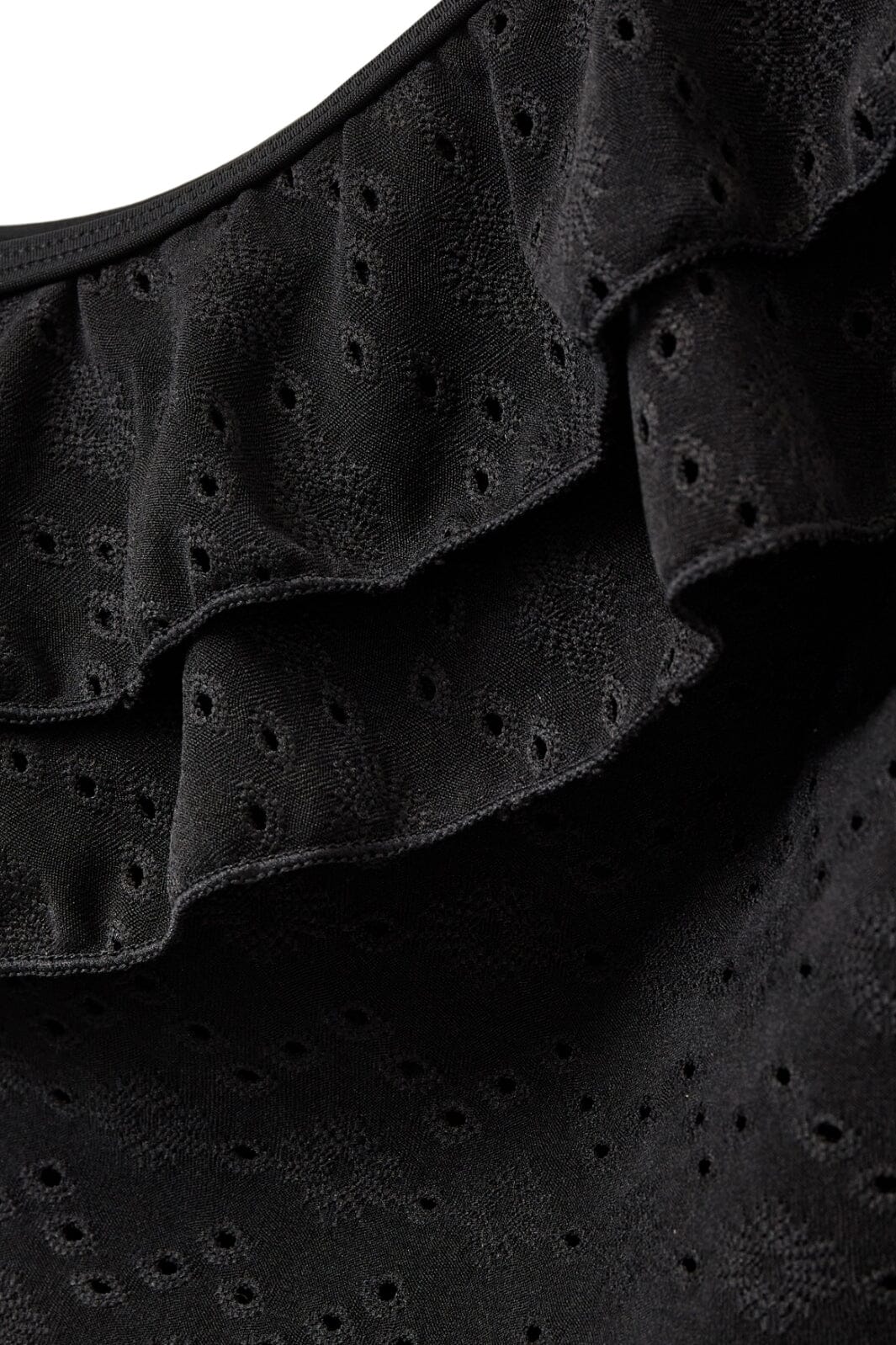 Schwarzer Badeanzug von Sofie Schnoor mit einem Schulterdesign. Er hat ein strukturiertes Muster mit kleinen Löchern und einem Volant entlang der Schulter.