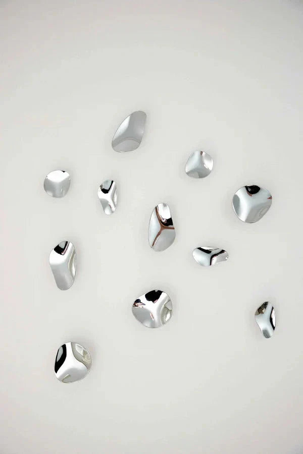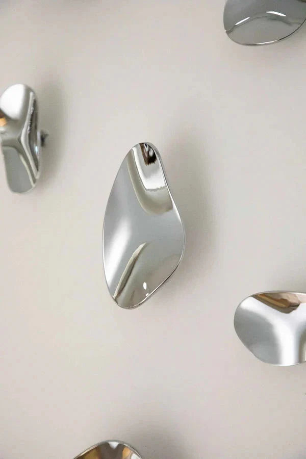 Ein länglicher Haken von Specktrum, gefertigt aus hartem Zinkmetall mit einer glänzenden Chromoberfläche in Silber. Das Design hat eine organische, asymmetrische Form.