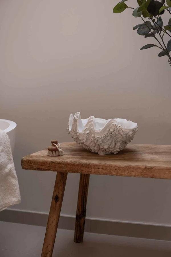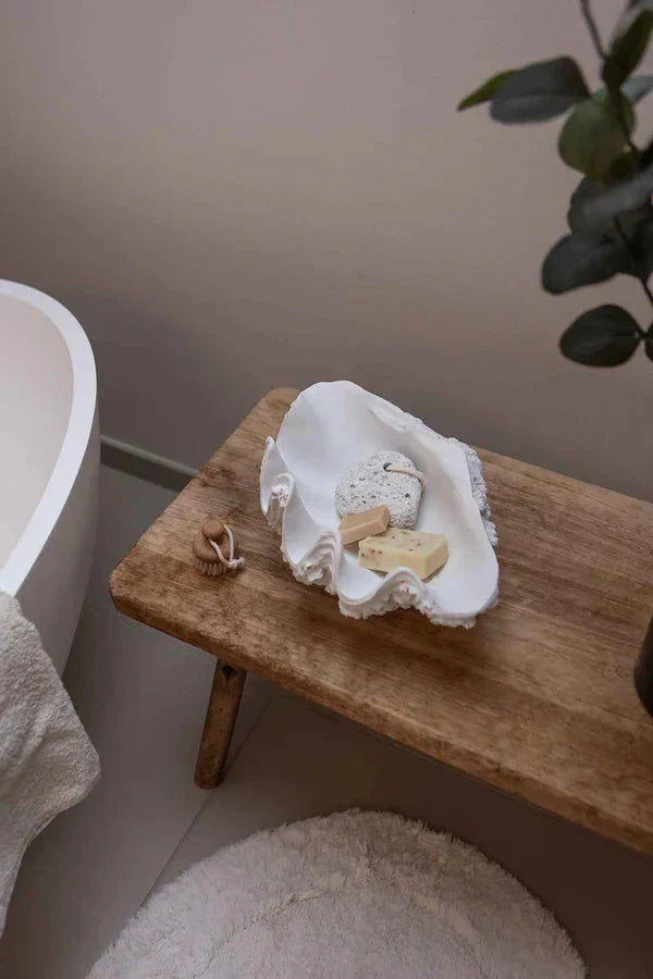 Weiße Schale von Specktrum in Muschelschalenform. Sie hat eine Oberfläche mit natürlichen Mustern und eine glatte, glänzende Innenseite. Die Schale kombiniert dekorativen Stil mit praktischer Funktion.