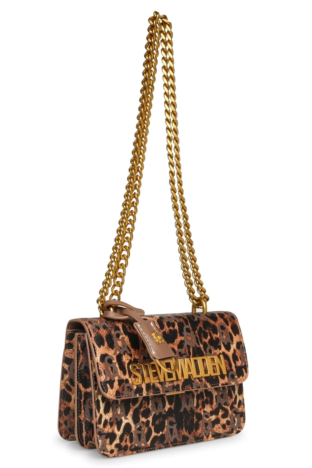 Tasche von Steve Madden mit Leopardenmuster in Schwarz und Braun. Die kompakte Tasche hat einen verstellbaren Kettenriemen und einen magnetischen Verschluss auf der Vorderseite.