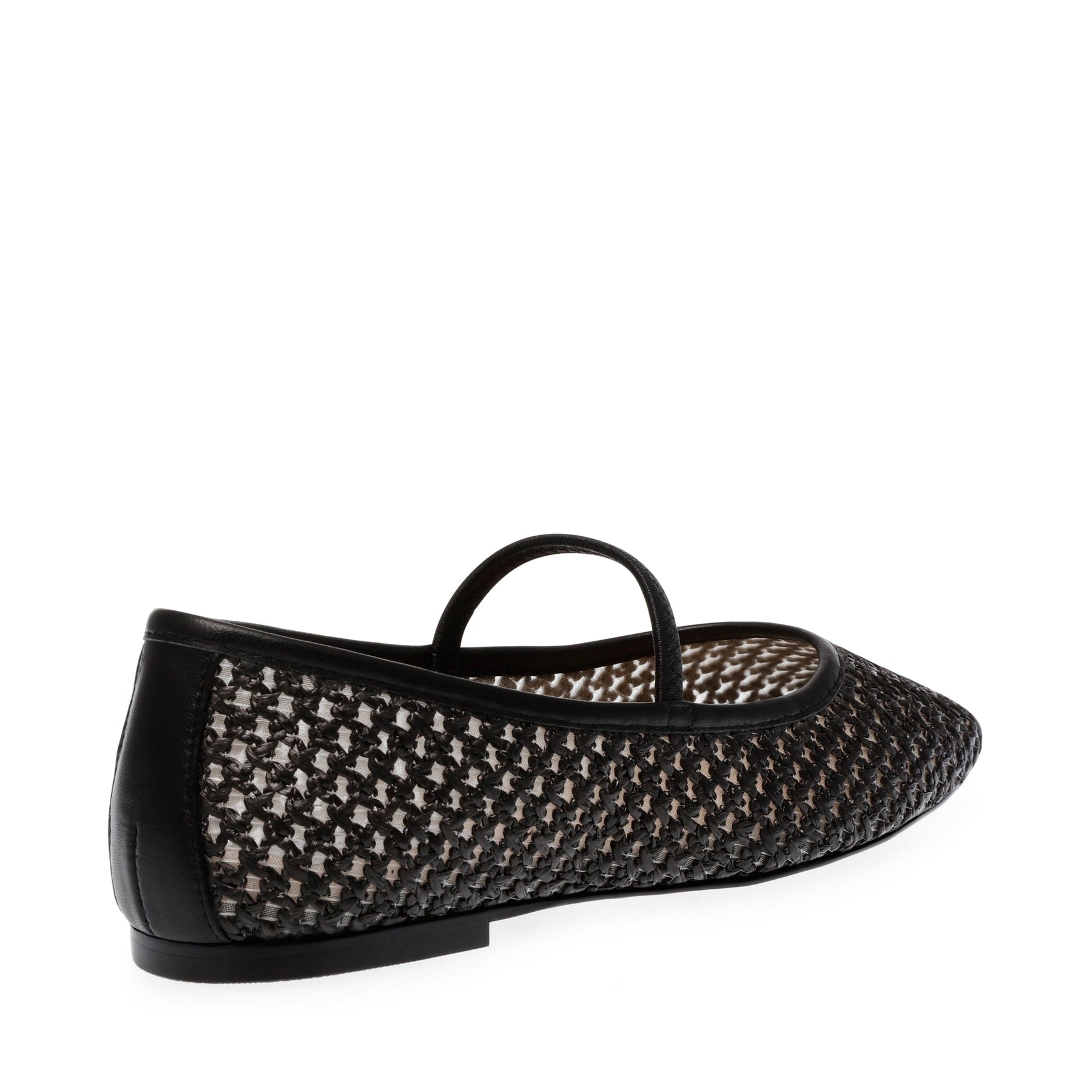 Schwarze Ballerinas von Steve Madden mit durchgehendem Flechtmuster. Der Schuh hat eine mandelförmige Spitze und ein elastisches Band am Knöchel, das guten Halt bietet.