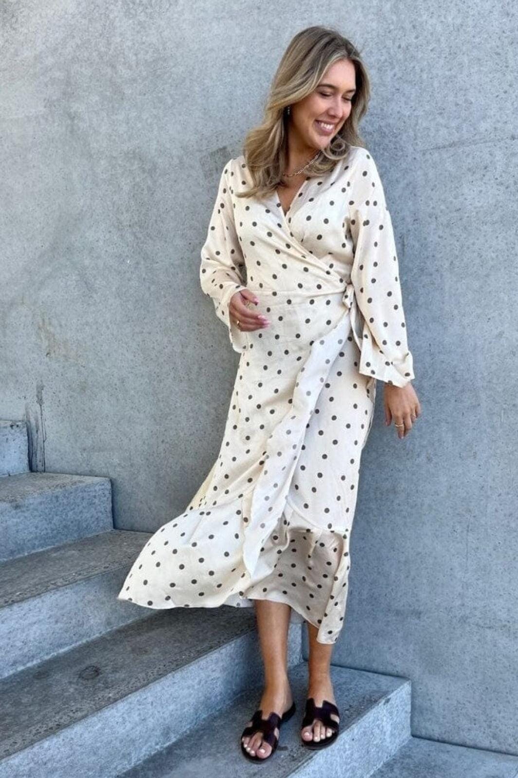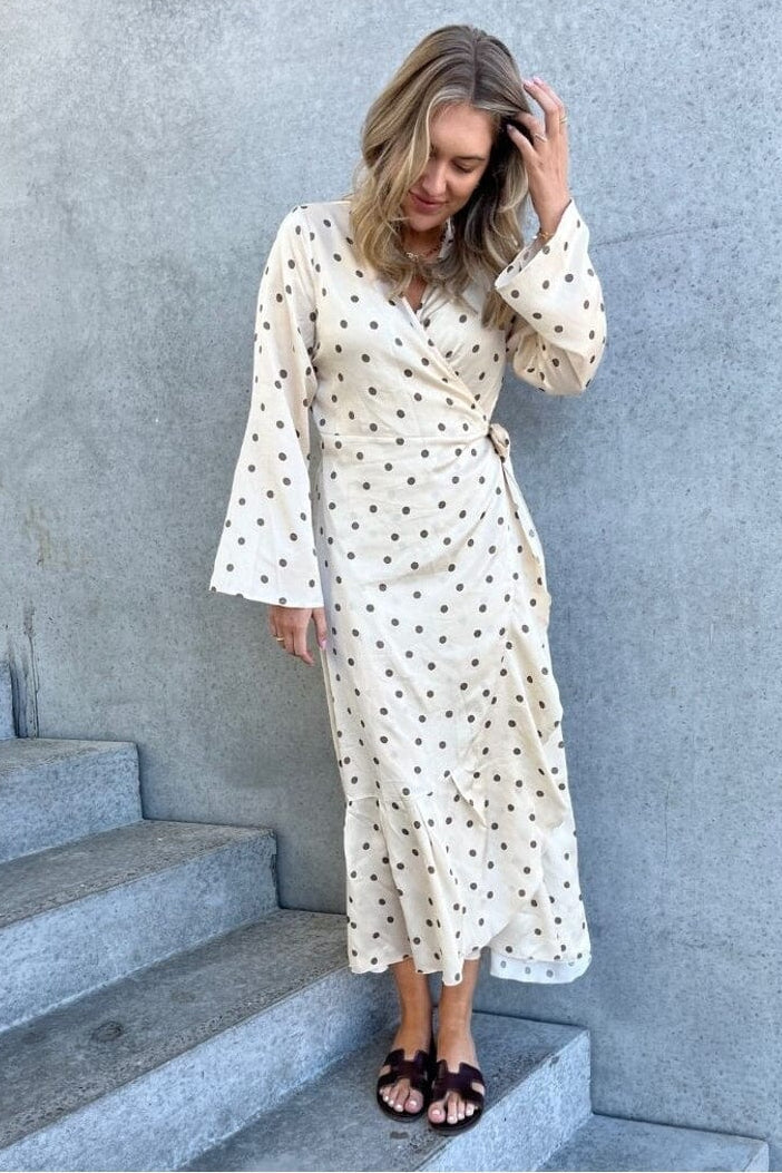 Kleid von Stories From The Atelier By Copenhagen Shoes in Off-White mit braunen Punkten. Das Kleid hat lange Ärmel und einen V-Ausschnitt mit Wickeleffekt.