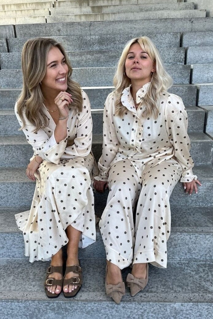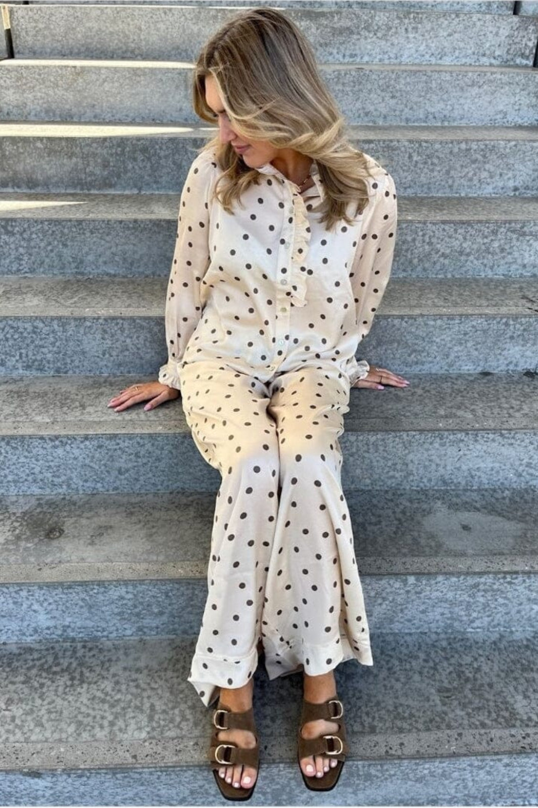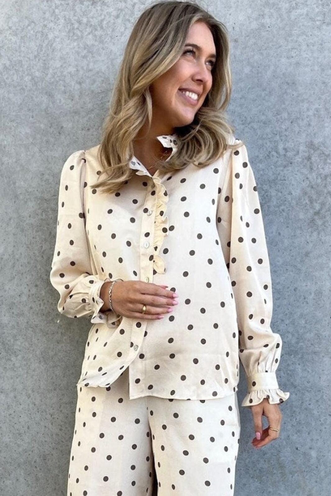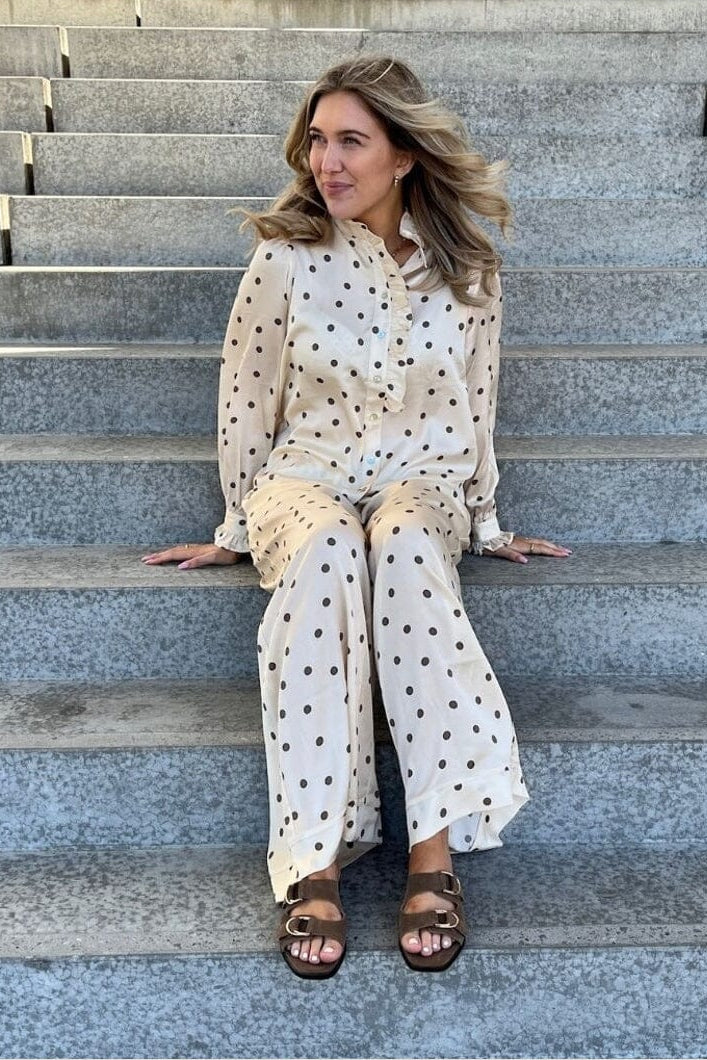 Eine offwhitefarbene Bluse mit braunen Punkten von Stories From The Atelier by Copenhagen Shoes. Die Bluse hat Rüschen-Details am Kragen und eine Knopfleiste vorn.