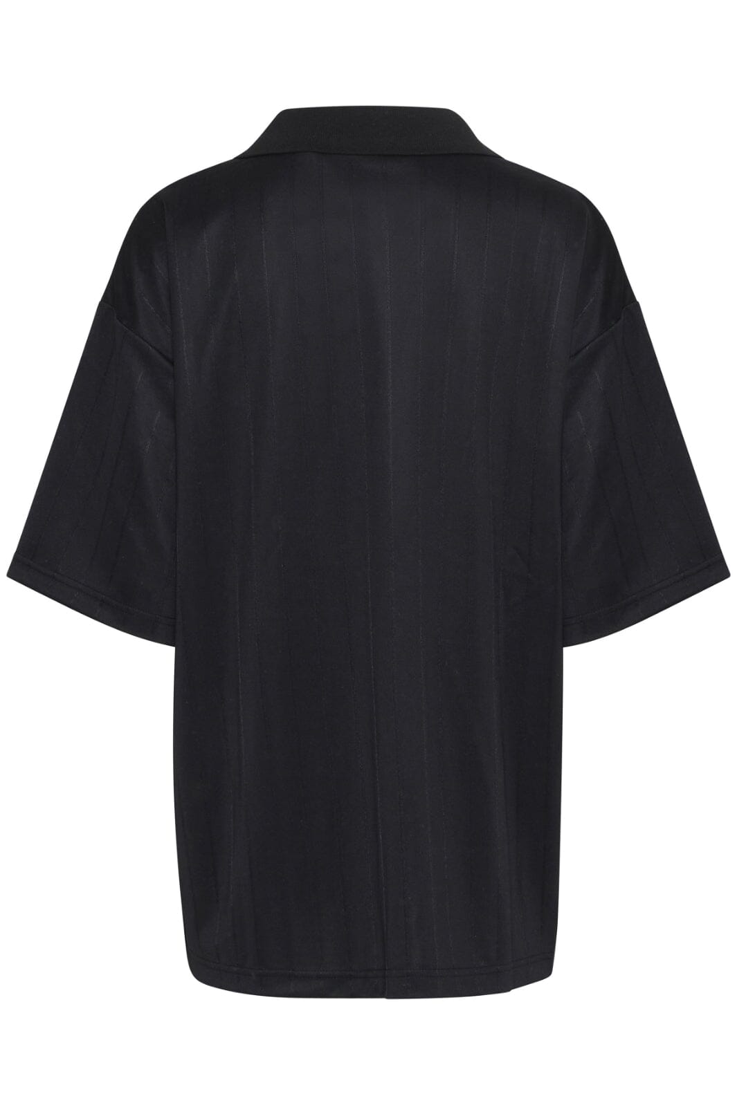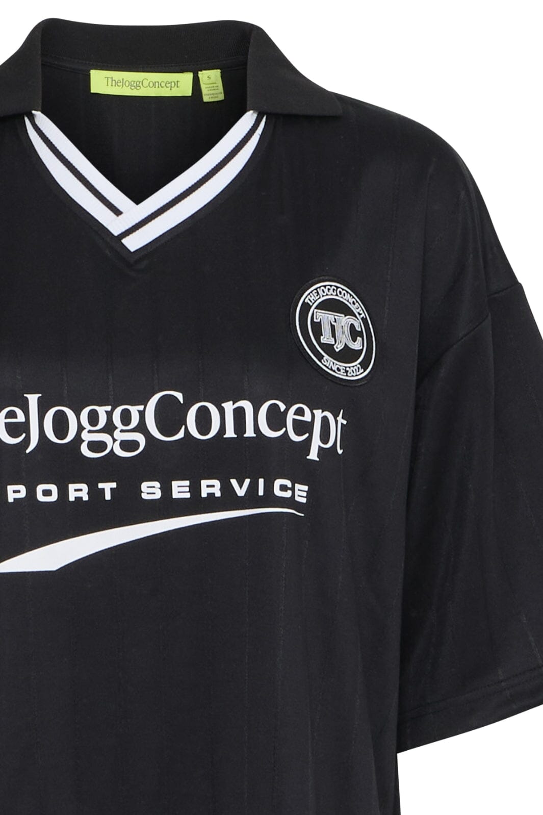 Schwarzes T-Shirt von The Jogg Concept mit V-Ausschnitt und einem subtilen Streifenmuster. Das T-Shirt hat einen sportlichen Stil und besteht aus recyceltem Polyester.